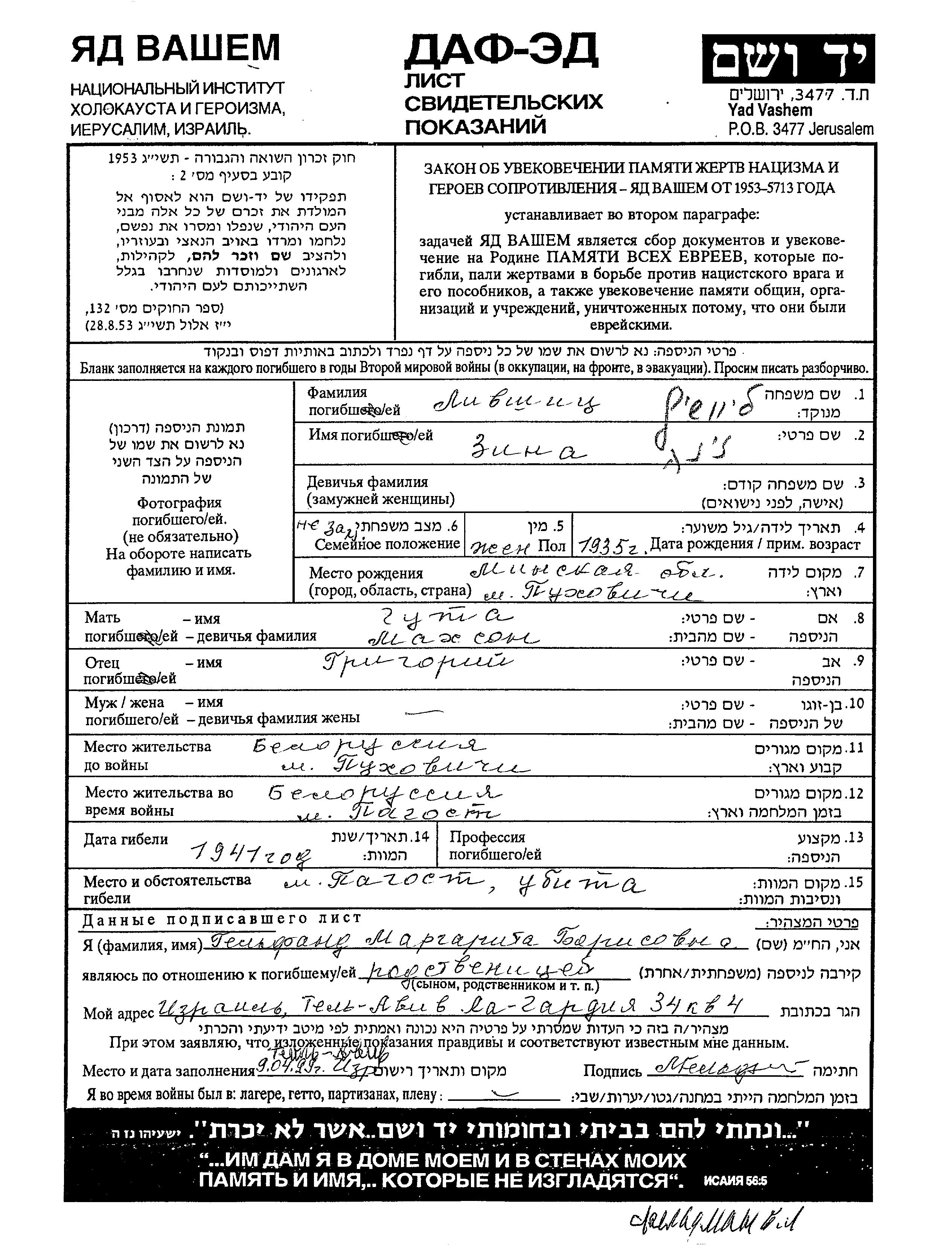 Livshitz Zina 1935 Pukhovichi, Belorussia (USSR) Page of Testimony