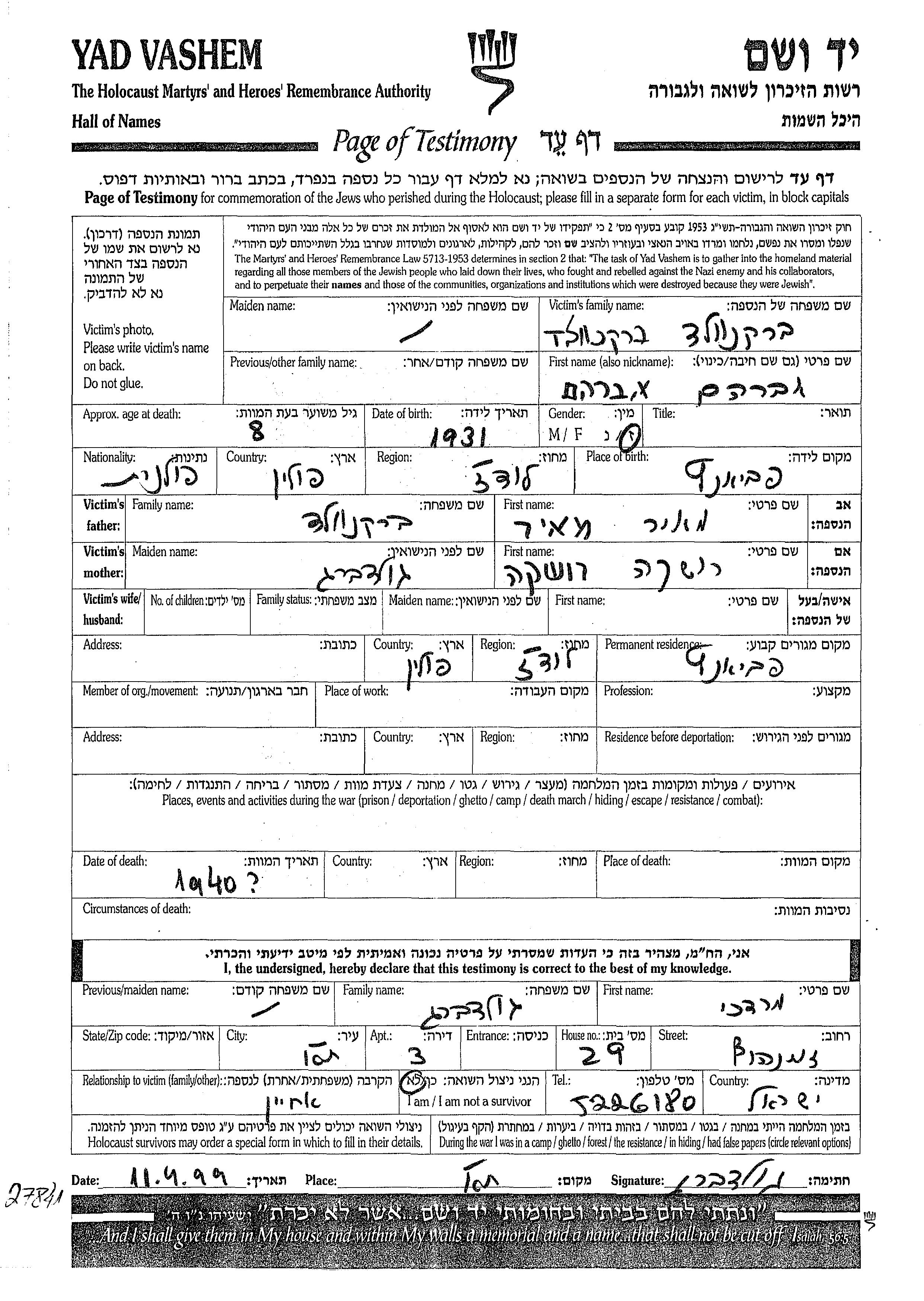 Avraham Berkenvald was born in Pabjanice, Poland, 1931 to Meir and Rushka. Prior to WWII he lived in Pabjanice, Poland. Avraham was murdered in the Shoah. Place of death: unknown, 1940.