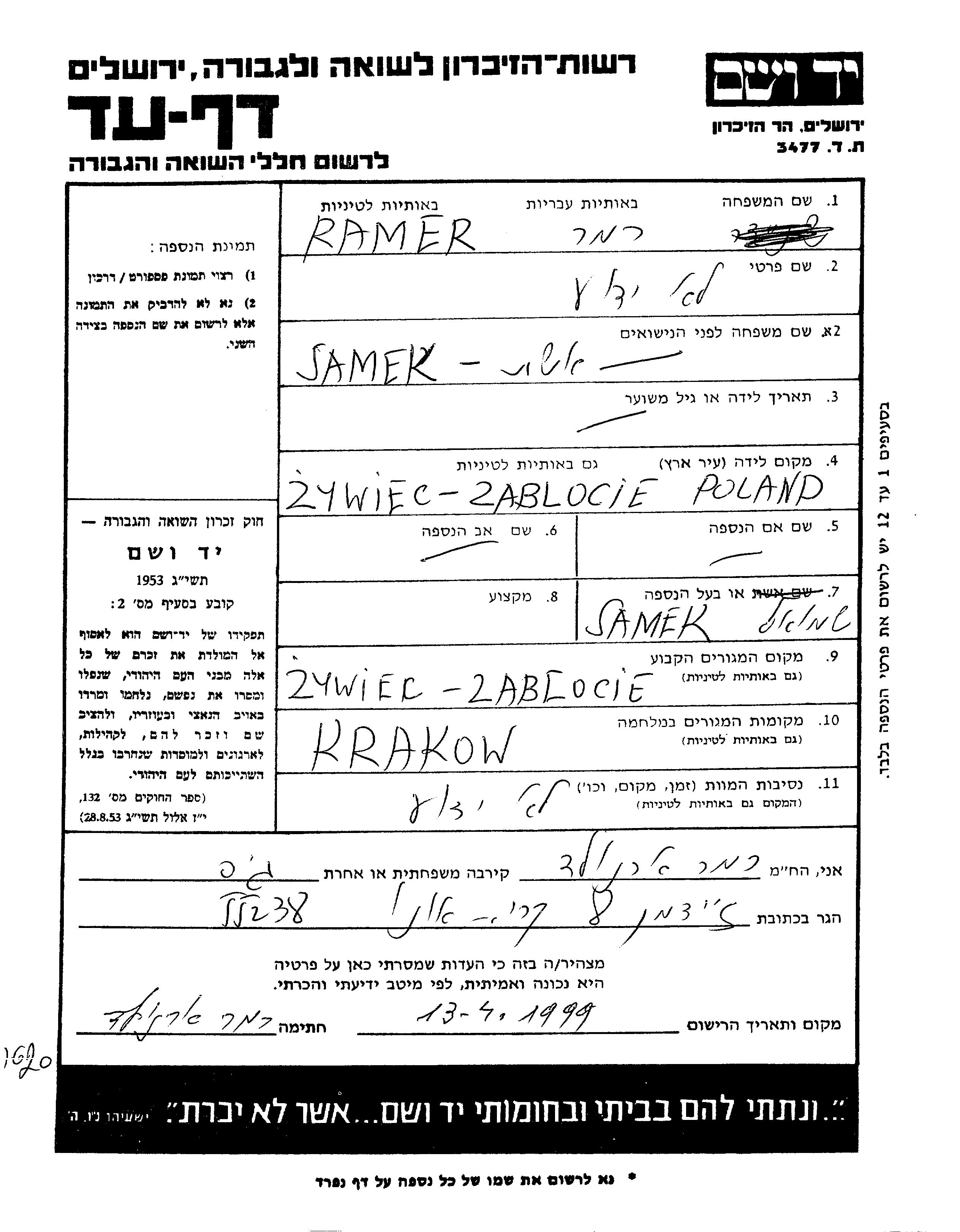 Ramer Remer First name unknown Zywiec, Poland Page of Testimony