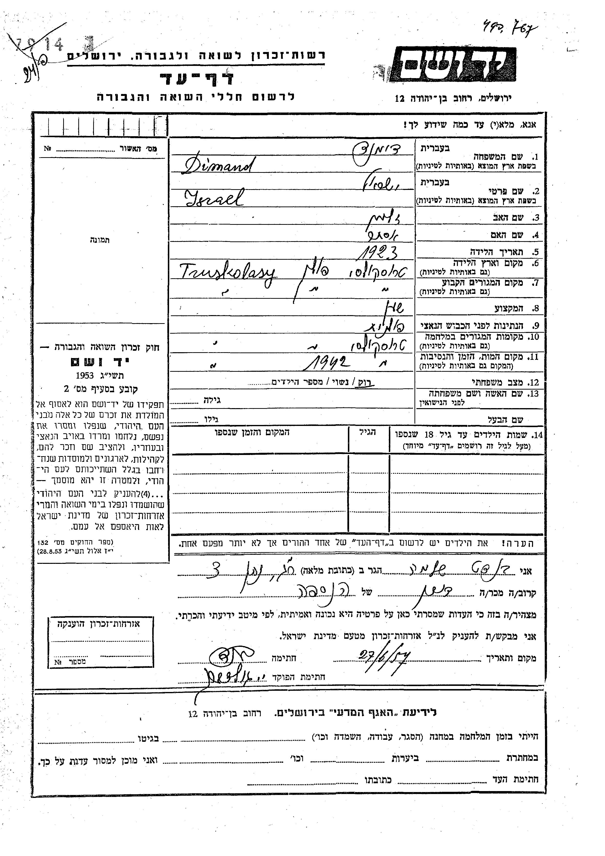 Ysrael Dimand was born in Truskolasy, Poland, 1923 to Zalman and Ester. He was a watchmaker and single. Prior to WWII he lived in Truskolasy, Poland. During the war he was in Truskolasy, Poland. Ysrael was murdered in the Shoah. Place of death: Truskolasy, Poland, 1942.