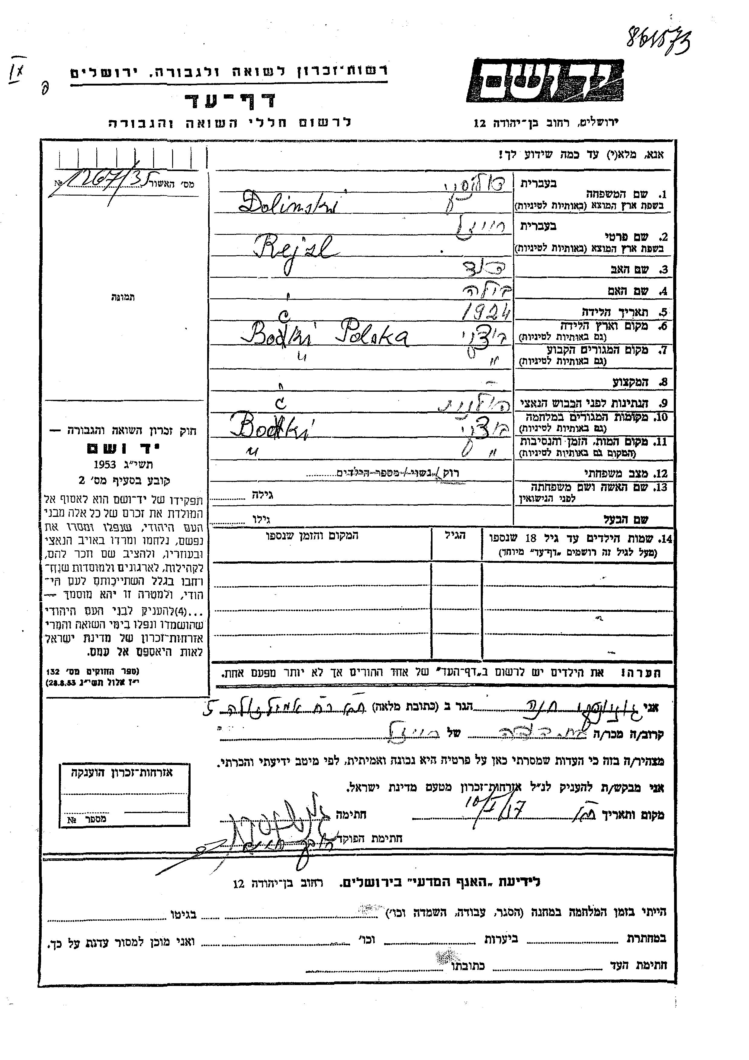 Rejzl Dolinski was born in Bocki, Poland, 1924 to David and Bila. She was single. Prior to WWII she lived in Bocki, Poland. During the war she was in Bocki, Poland. Rejzl was murdered in the Shoah. Place of death: Bocki, Poland.