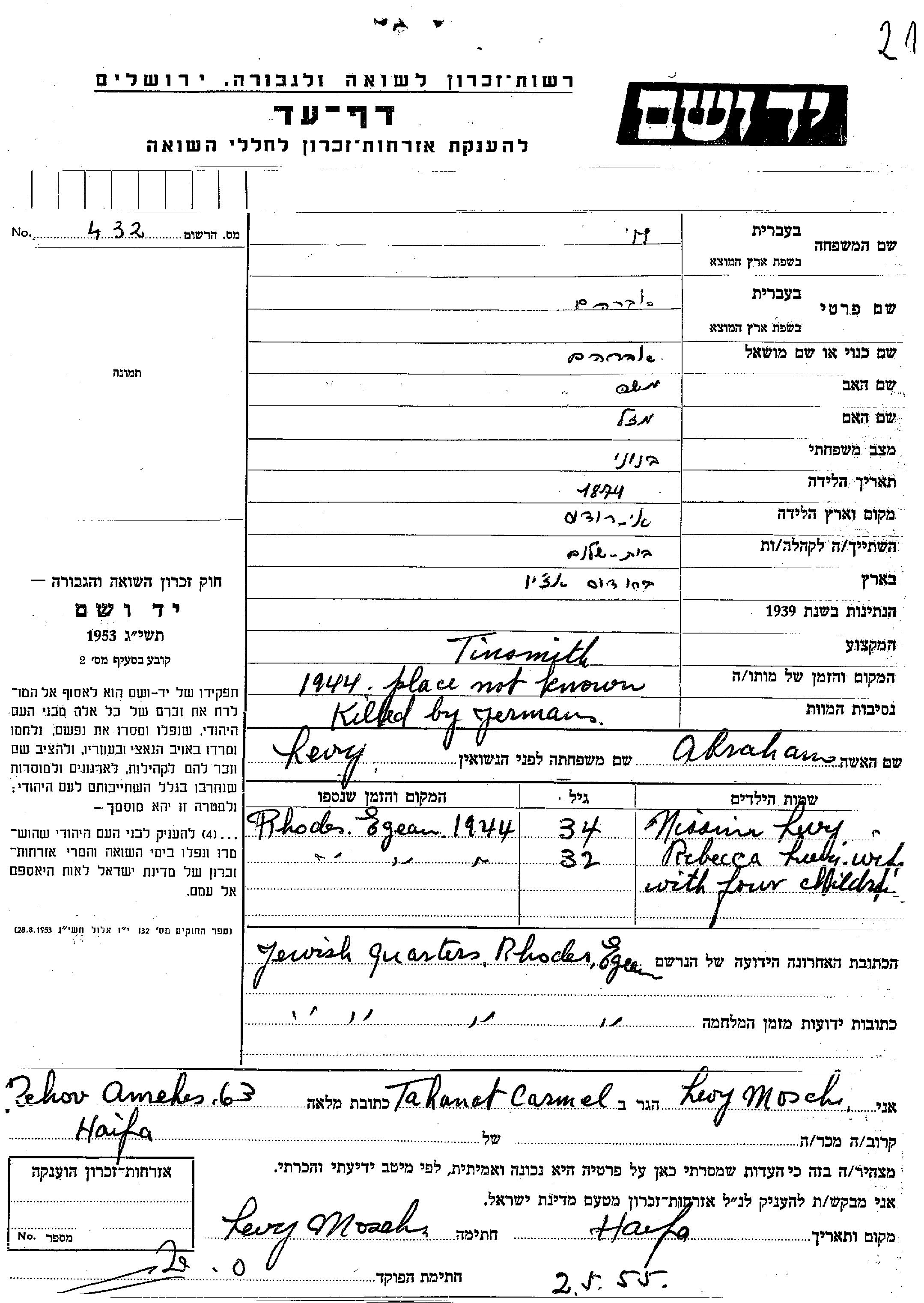 Levi Nissim 1934 Rodi, Italy Page of Testimony