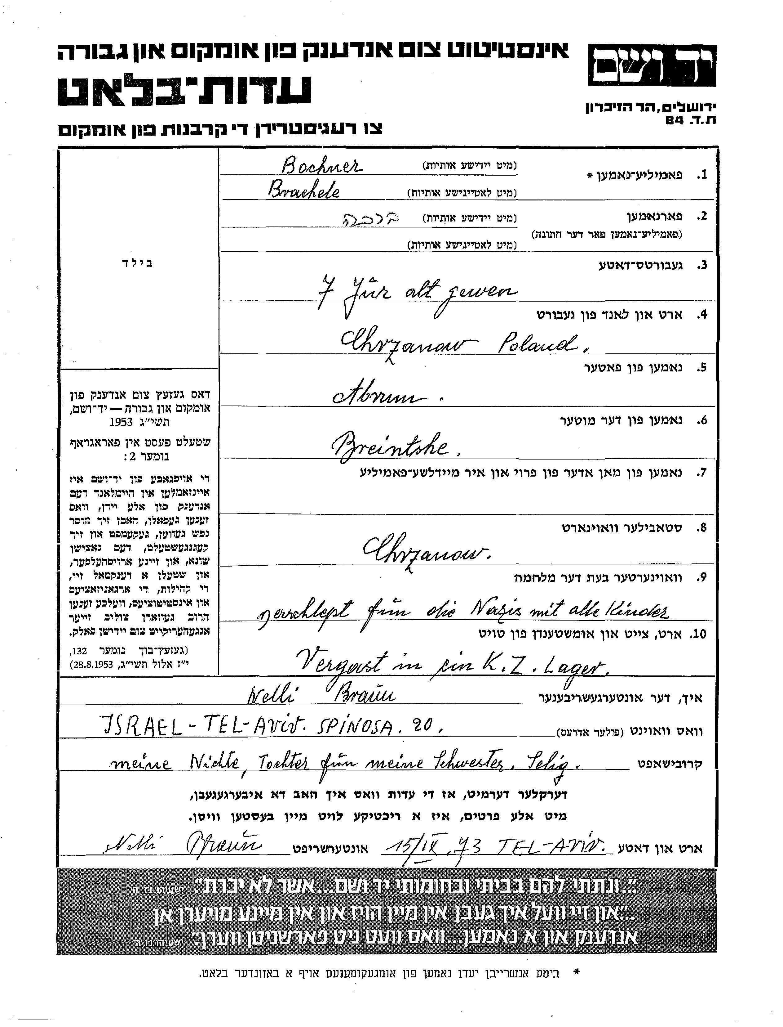 Bochner Brachele Chrzanow, Poland Page of Testimony