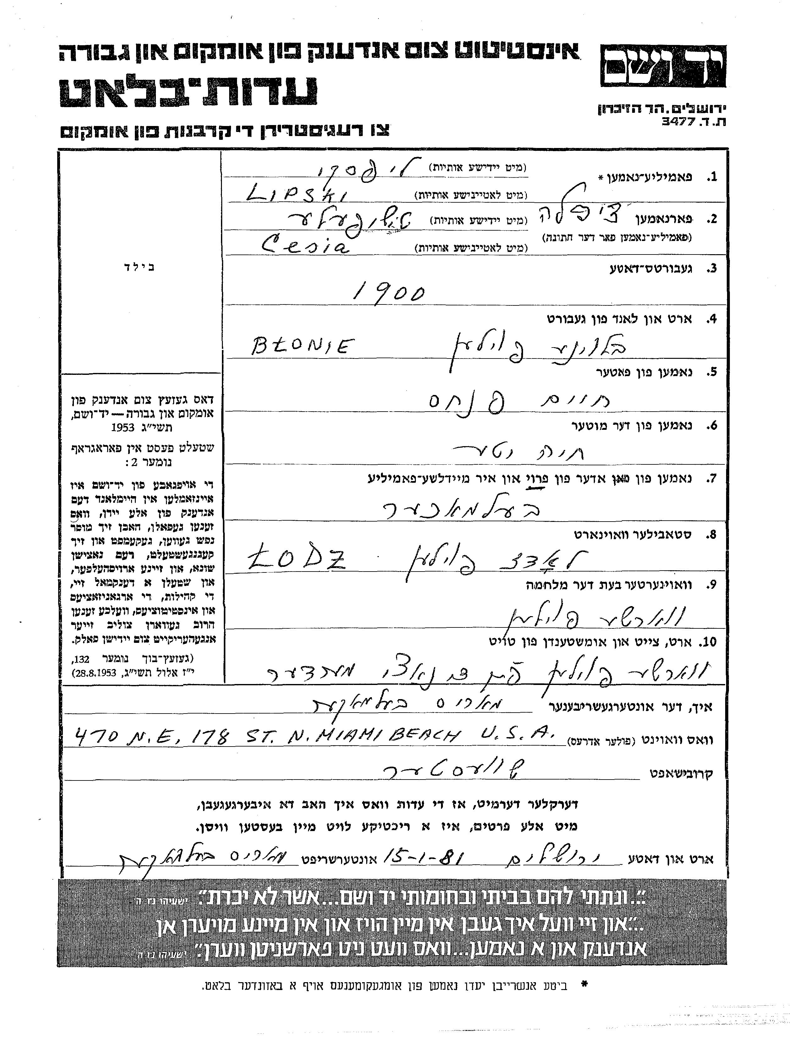 Lipski Cesia Tzipla 1900 Lodz, Poland Page of Testimony
