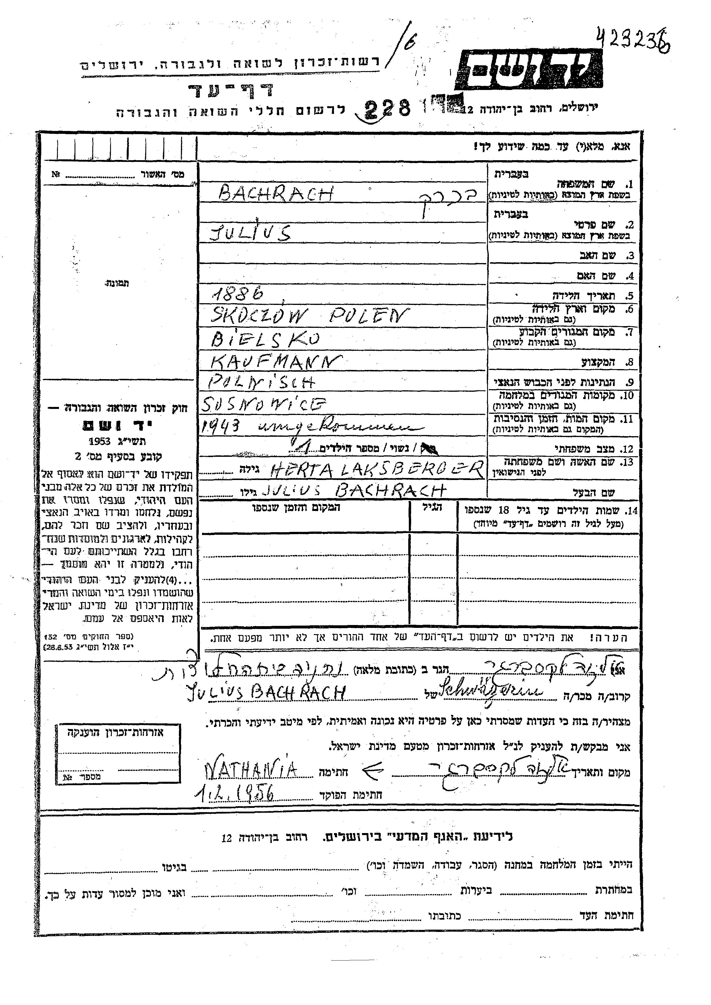 Julius Bachrach was born in Skoczow, Poland, 1886. He was a merchant and married to Herta nee Laksberger. Prior to WWII he lived in Bielsko, Poland. During the war he was in Sosnowiec, Poland. Julius was murdered in the Shoah. Place of death: unknown, 1943.