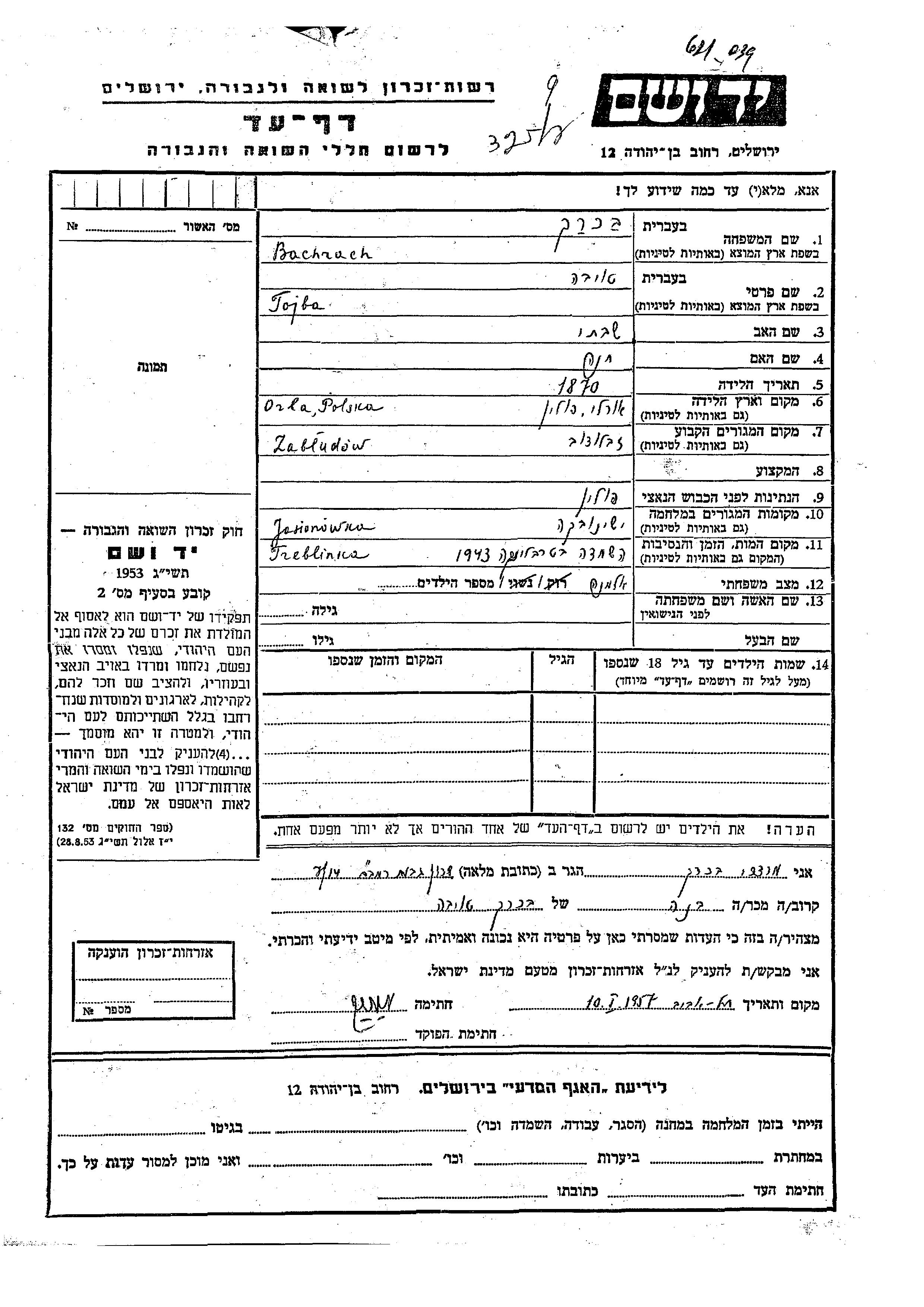 Tojba Bachrach was born in Orla, Poland, 1870 to Shabtai and Khana. She was a widow. Prior to WWII she lived in Zabludow, Poland. During the war she was in Jasionowka, Poland. Tojba was murdered in the Shoah. Place of death: Treblinka I, Poland, 1943.