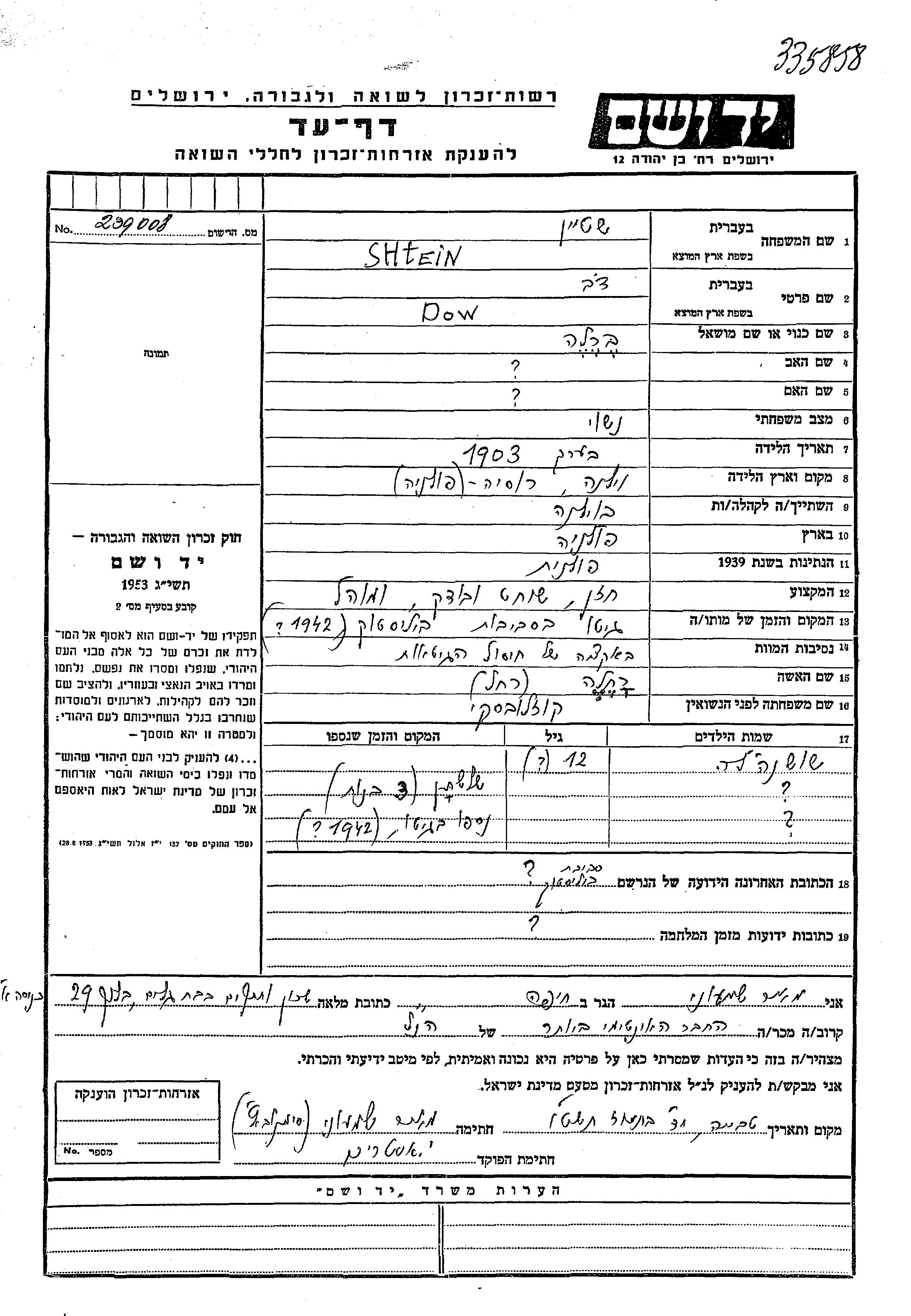 Shtein Shoshanale unstated place, Page of Testimony