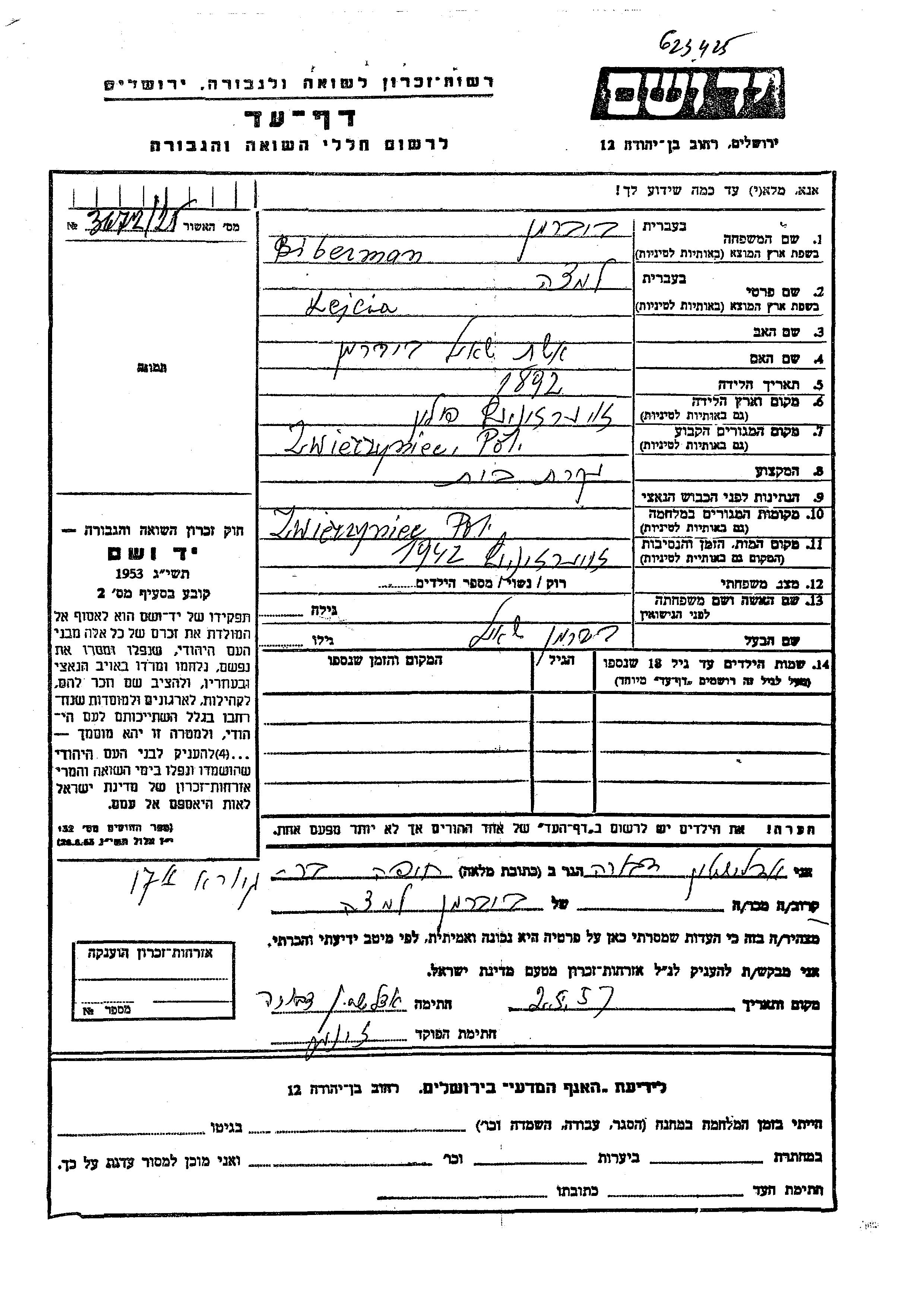 Lejcia Biberman was born in Zwierzyniec, Poland, 1892. She was a housewife and married to Shaul. Prior to WWII she lived in Zwierzyniec, Poland. During the war she was in Zwierzyniec, Poland. Lejcia was murdered in the Shoah. Place of death: Zwierzyniec, Poland, 1942.