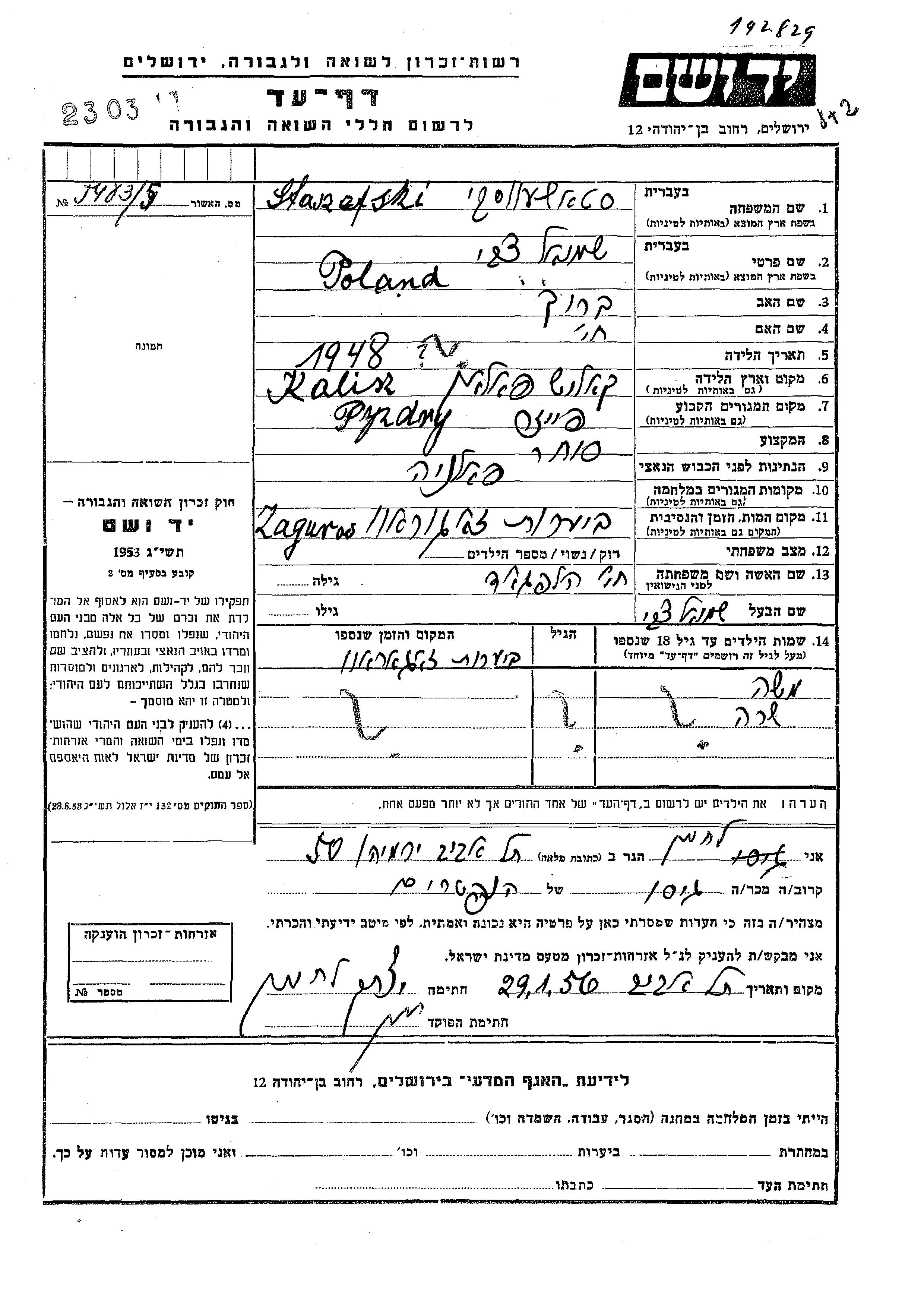 Moshe Staszefski was born to Shmuel Tzvi and Khai nee Helfgod. He was child. Prior to WWII he lived in Pyzdry, Poland.