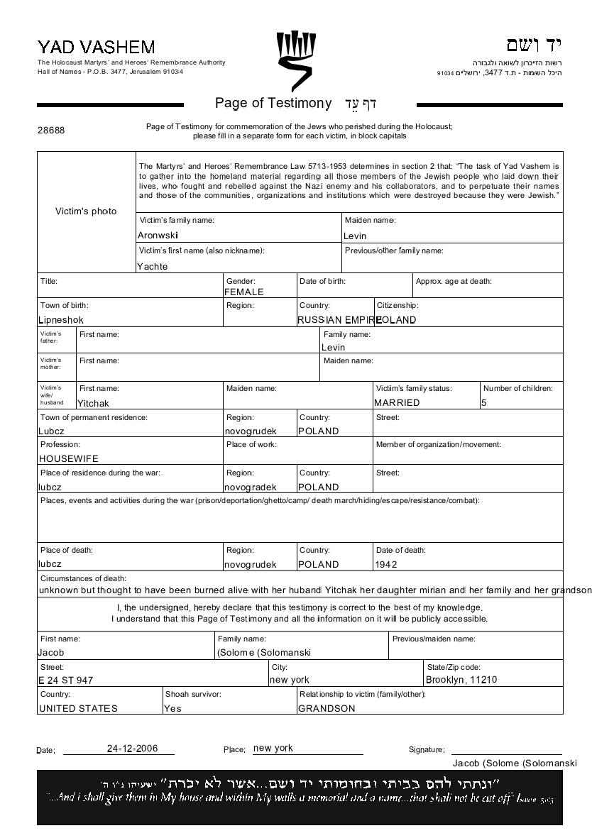 Aronowski Mirian Lubcz, Poland Page of Testimony (digital)