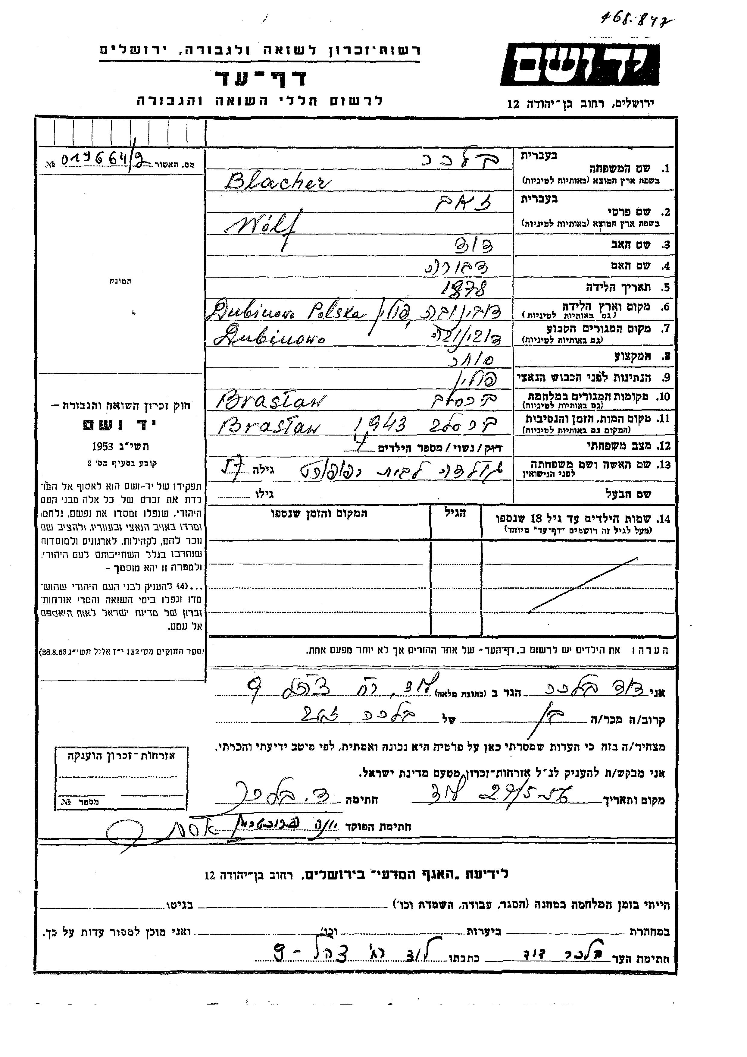 Wolf Zeev Blacher was born in Dubinowo, Poland, 1878 to David and Dvora. He was a merchant and married to Golda nee Rapoport. Prior to WWII he lived in Dubinowo, Poland. During the war he was in Braslaw, Poland. Wolf Zeev was murdered in the Shoah. Place of death: Braslaw, Poland, 1943.
