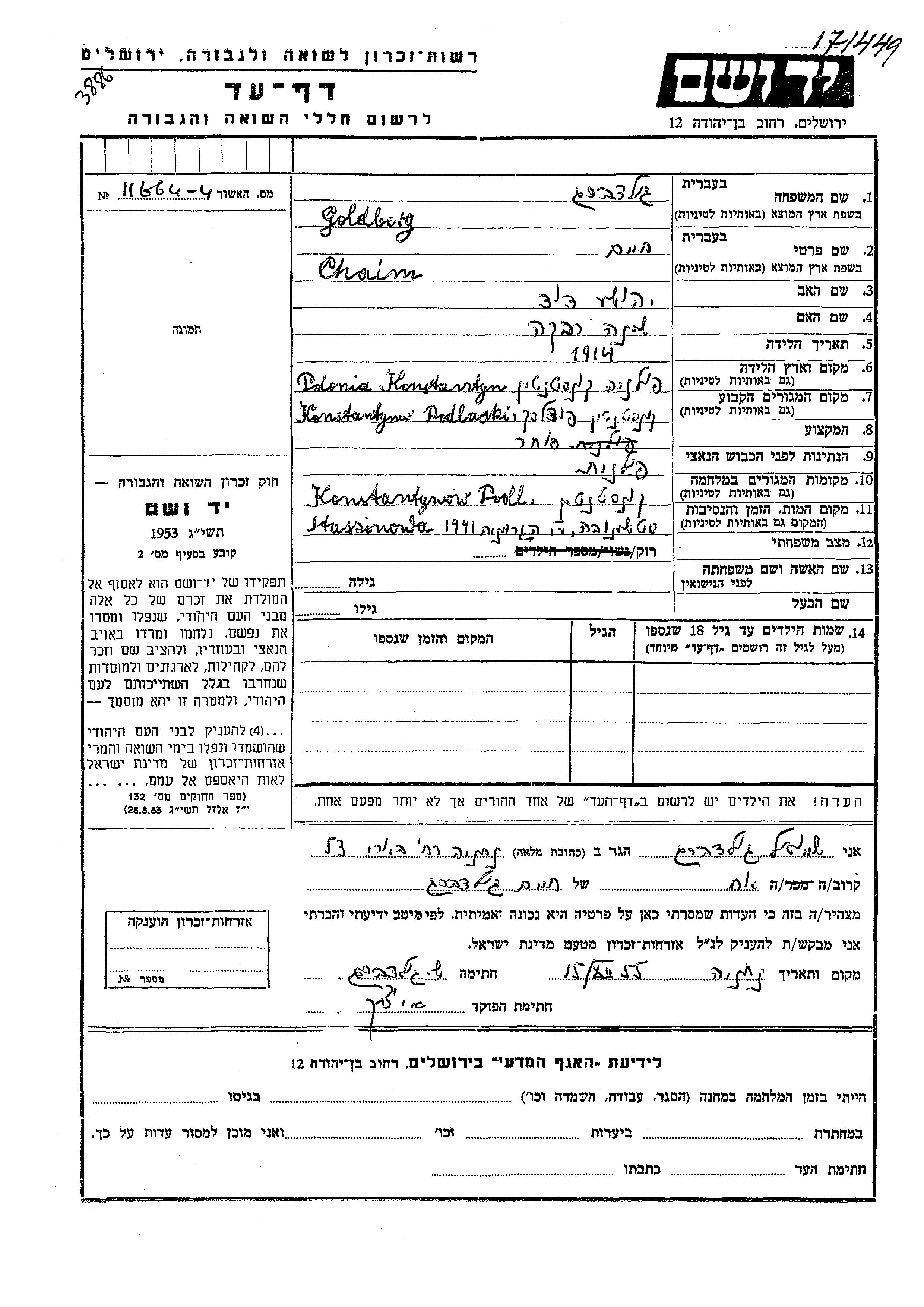 Chaim Goldberg was born in Konstantynów, Poland, 1914 to Yehoshua David and Sheina Rivka. He was a merchant and single. Prior to WWII he lived in Konstantynow nad Bugiem, Poland. During the war he was in Konstantynow nad Bugiem, Poland. Chaim was murdered in the Shoah. Place of death: Stasinowa, Poland, 1941.