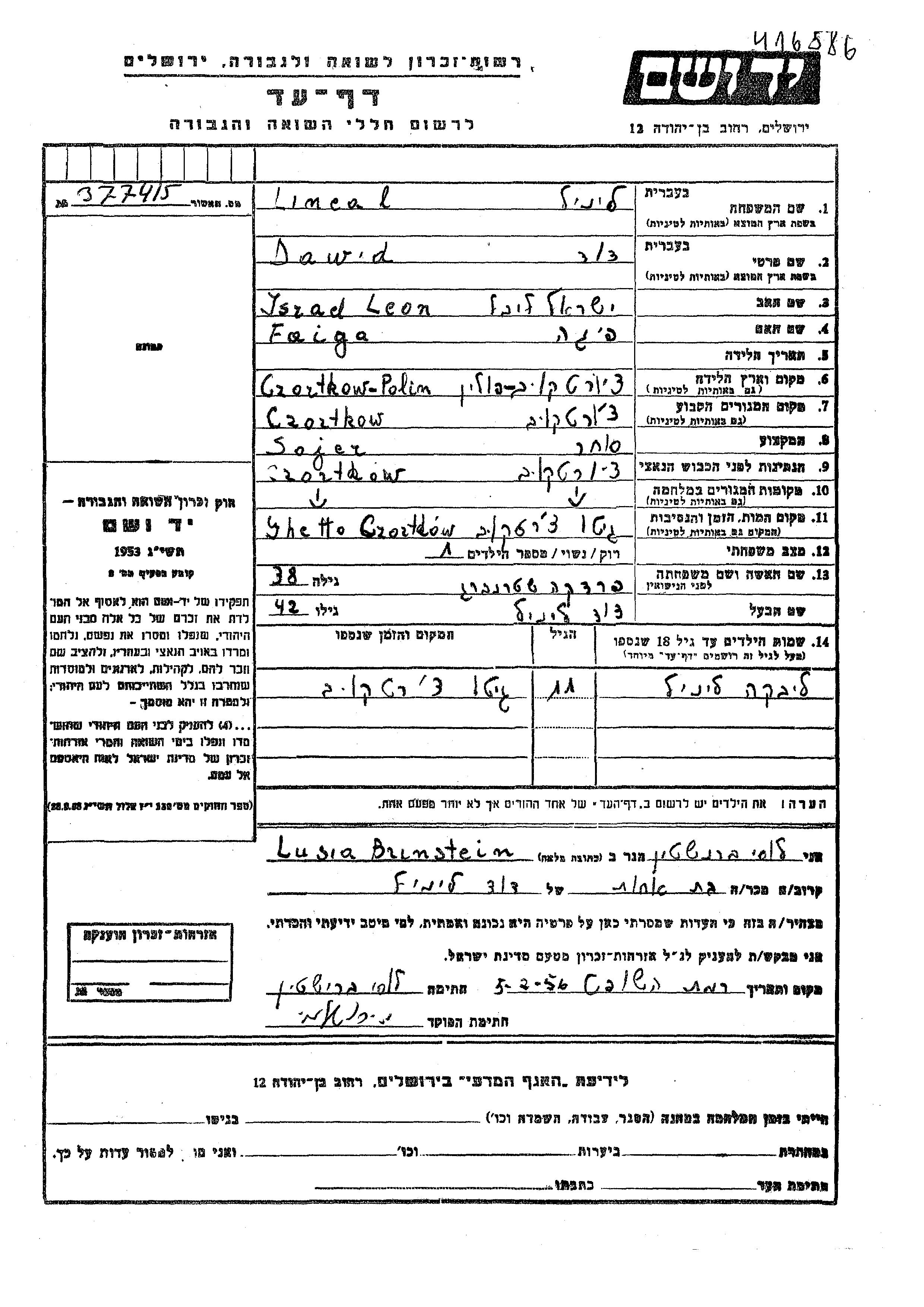 Lineal Libka Czortkow, Poland Page of Testimony
