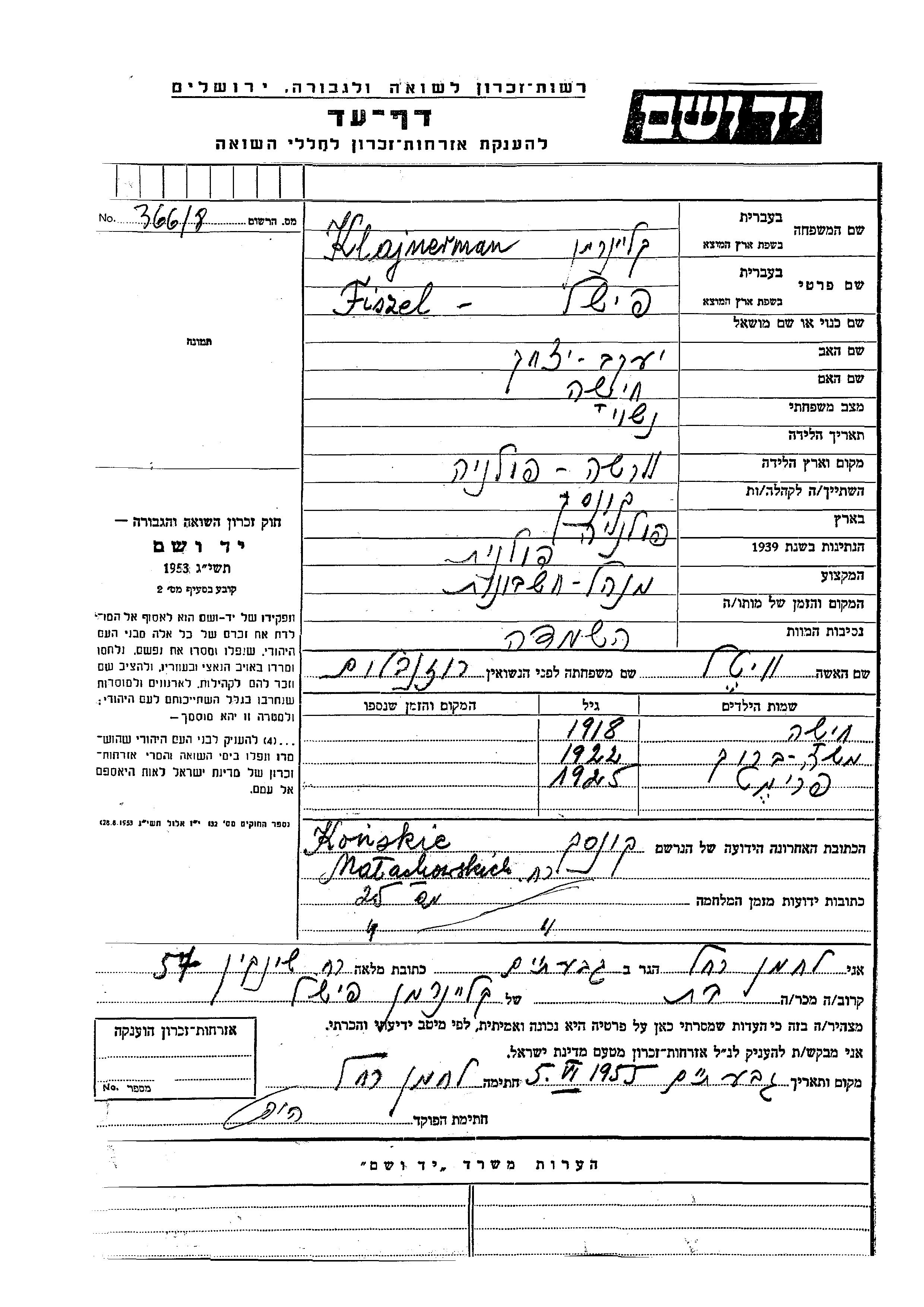 Klajnerman Moshe Barukh 1924 Końskie, Poland Page of Testimony