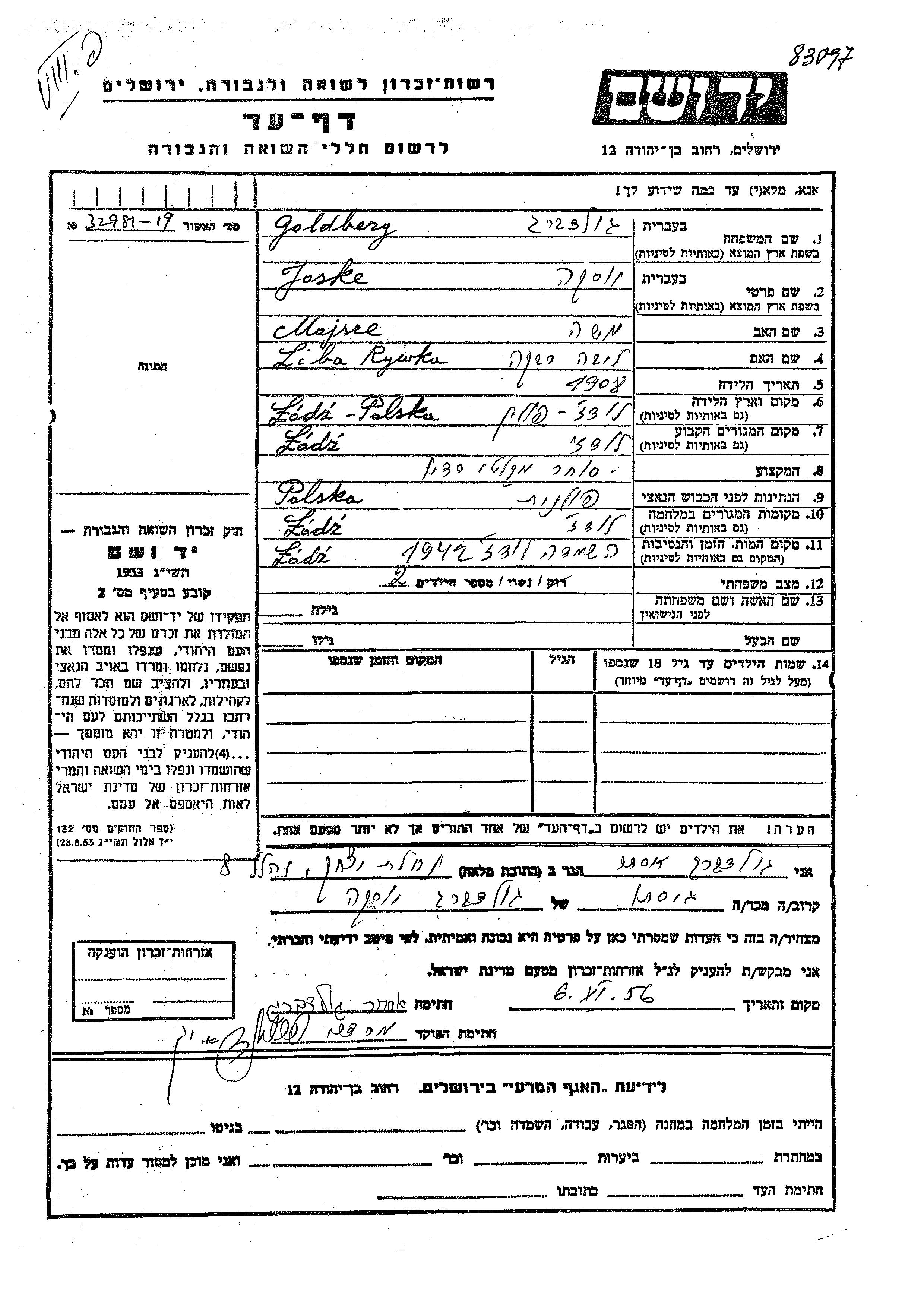 Joske Goldberg was born in Lodz, Poland, 1908 to Mojsze and Ryvka Liba. He was a סוחר מקלטי רדיו and married. Prior to WWII he lived in Lodz, Poland. During the war he was in Lodz, Poland. Joske was murdered in the Shoah. Place of death: Lodz, Poland, 1942.