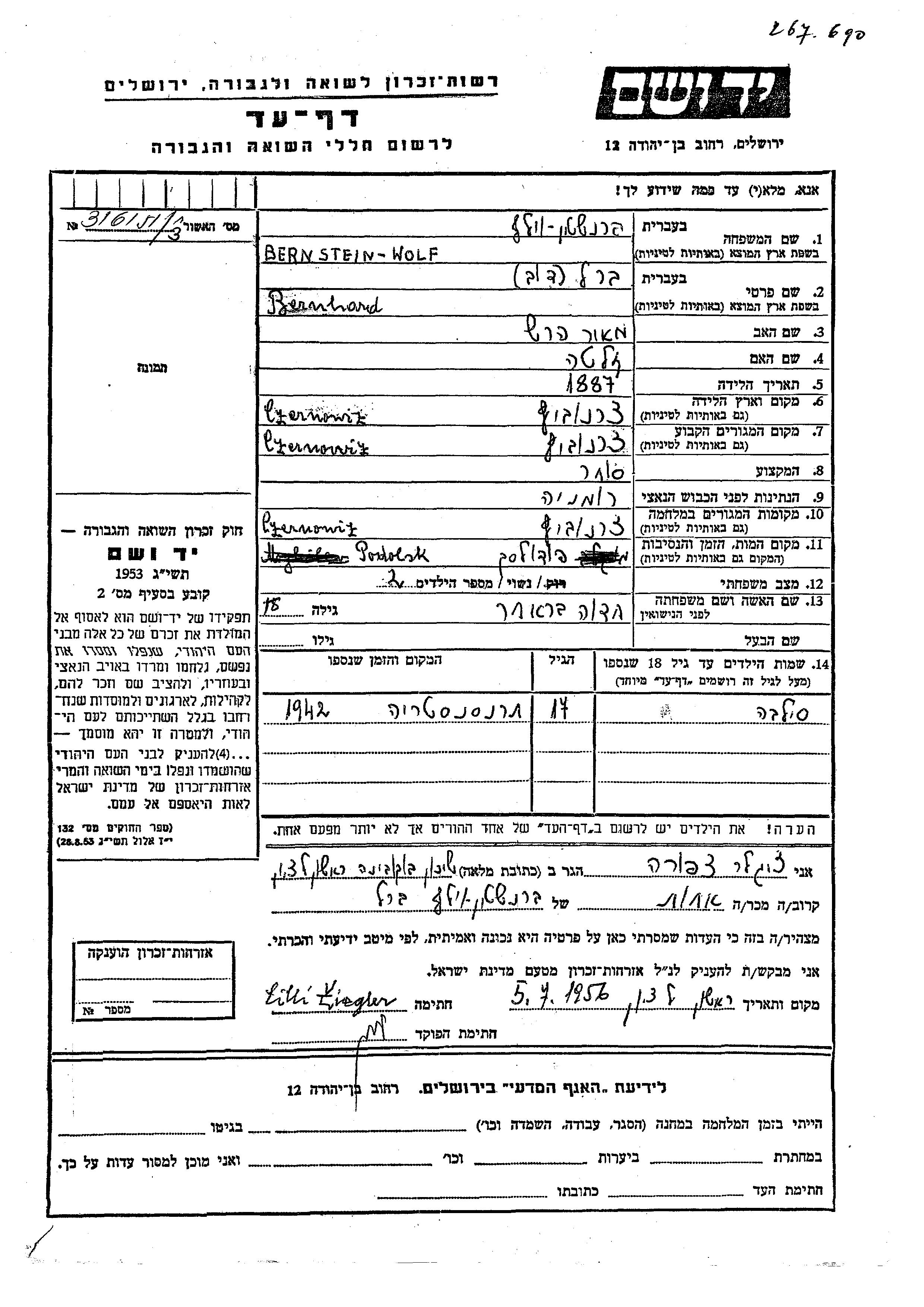 Silva Bernstein Wolf was born to Bernhard Berl Dov and Chedva nee Brauer. She was child. Prior to WWII she lived in Czernowitz, Romania. During the war she was in Czernowitz, Romania. Silva was murdered in the Shoah.