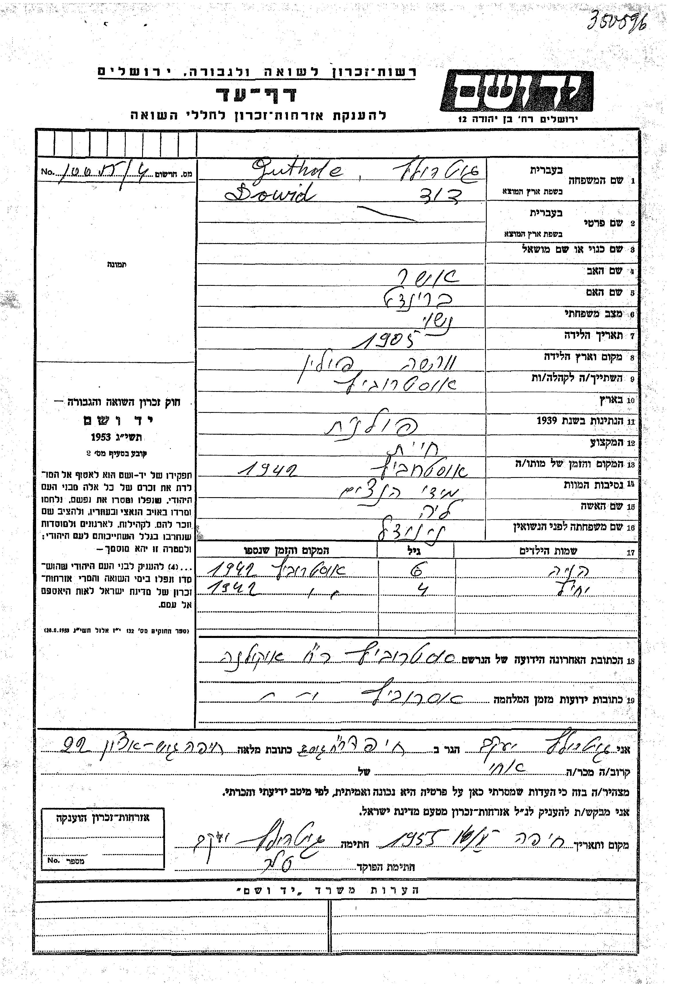 Iyekhil Gutholc was born to Dowid and Liya nee Ninadel. He was child. Prior to WWII he lived in Ostrowitz, Poland. During the war he was in Ostrowitz, Poland. Iyekhil was murdered in the Shoah.