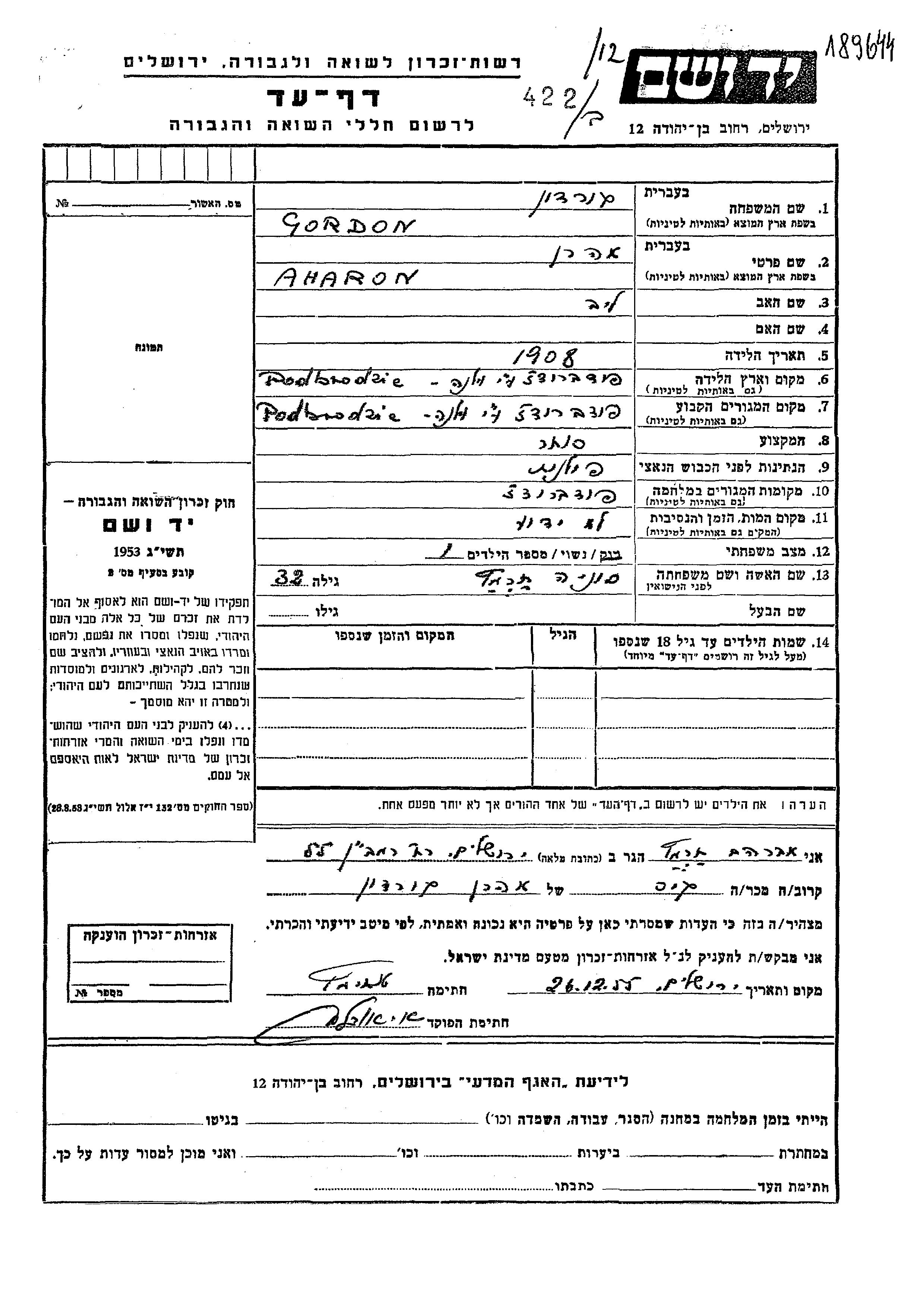 Gordon Aharon 1908 Podbrodzie, Poland Page of Testimony