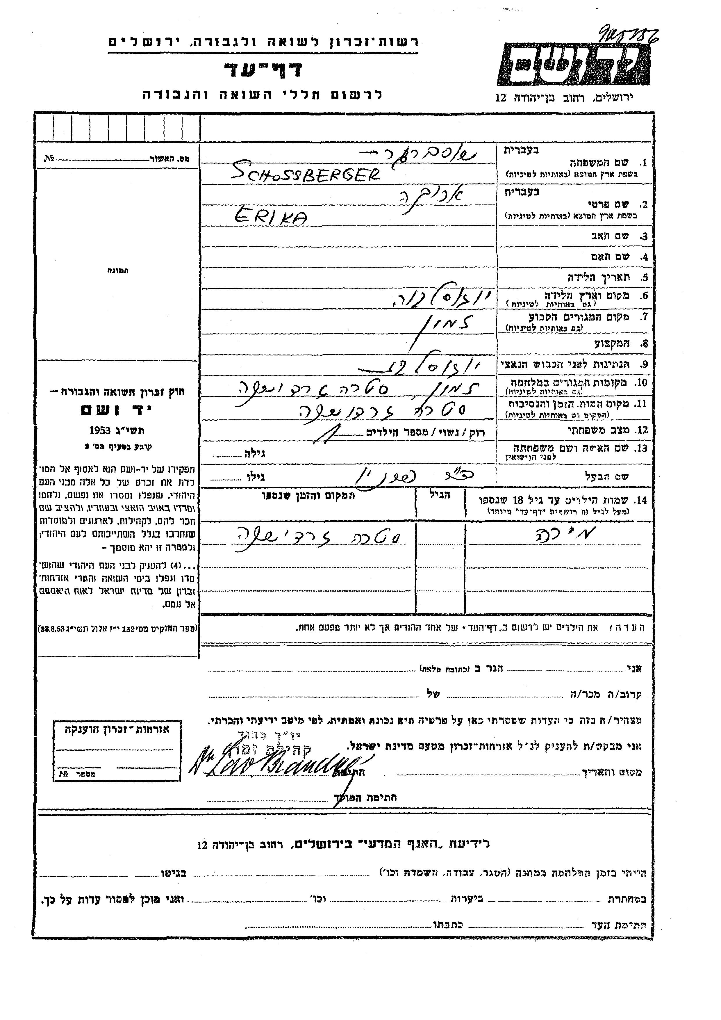 Schossberger Mira Zemun, Yugoslavia Page of Testimony