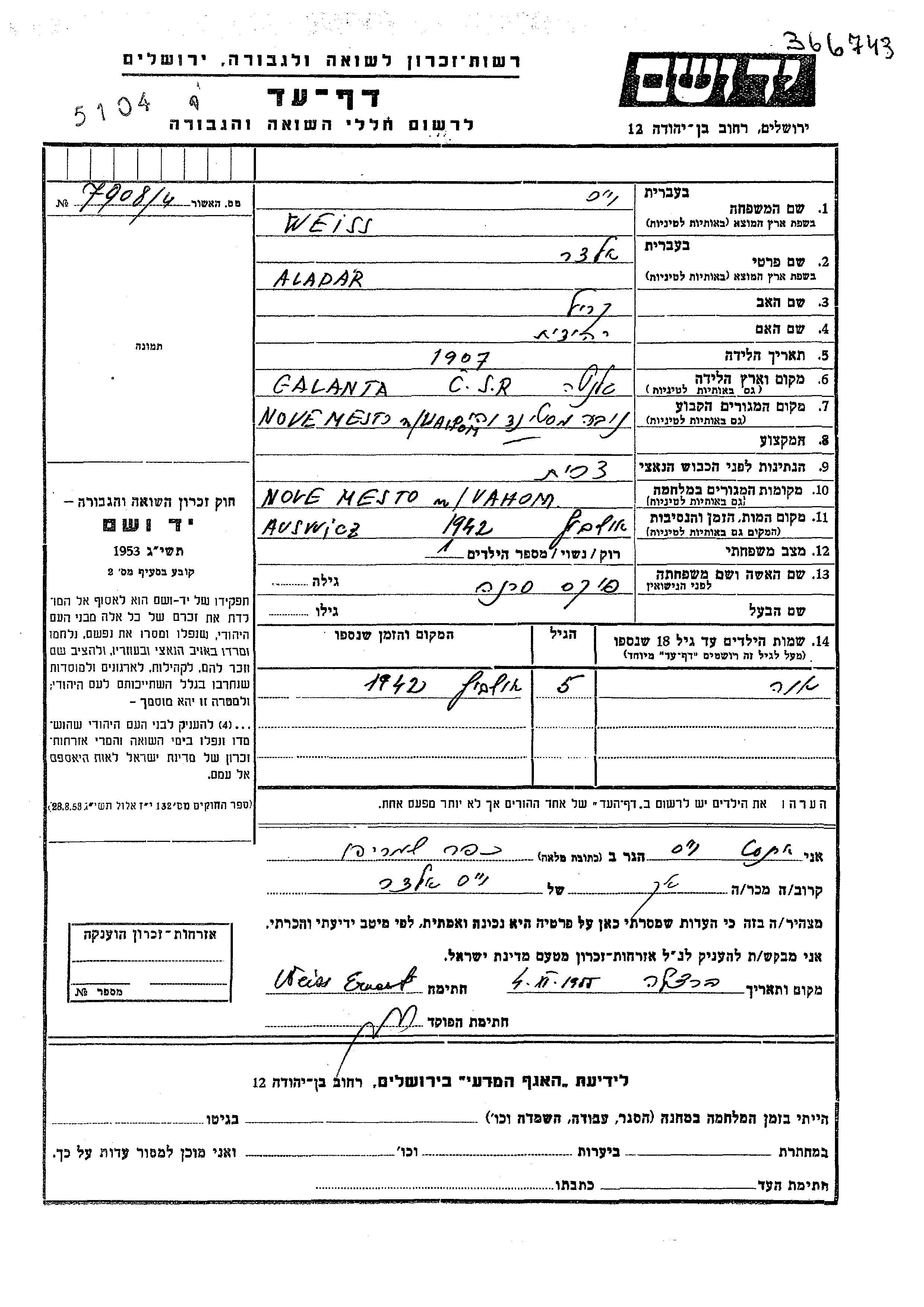 Eva Weiss was born to Aladar and Serena nee Fuks. She was child. Prior to WWII she lived in Nowe Miasto, Poland. During the war she was in Nowe Miasto, Poland.