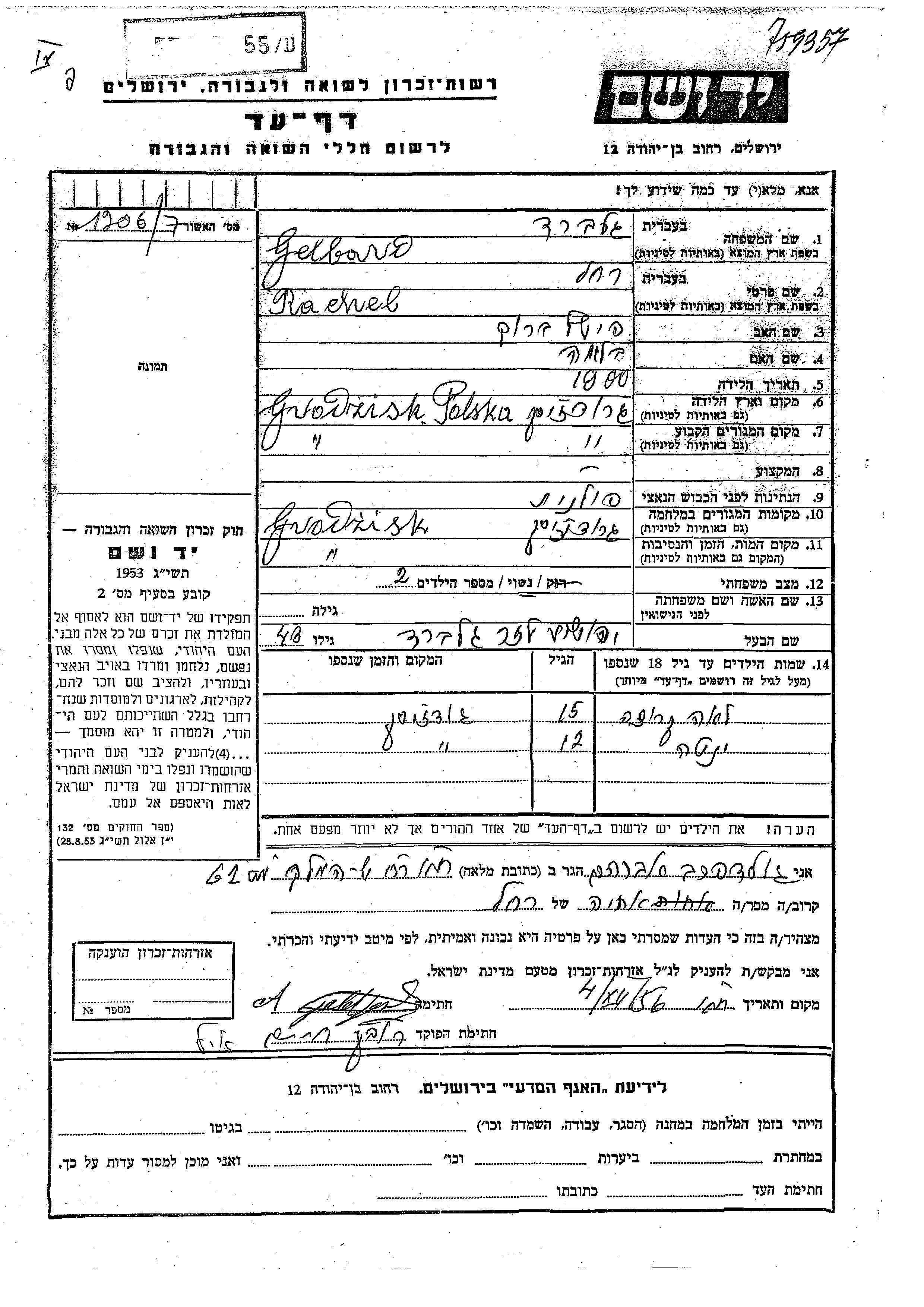Yenta Gelbard was born to Yehoshua Lazar and Rachel nee Gelbard. Was child. Prior to WWII lived in Gwozdziec, Poland. During the war was in Gwozdziec, Poland. Yenta was murdered in the Shoah.