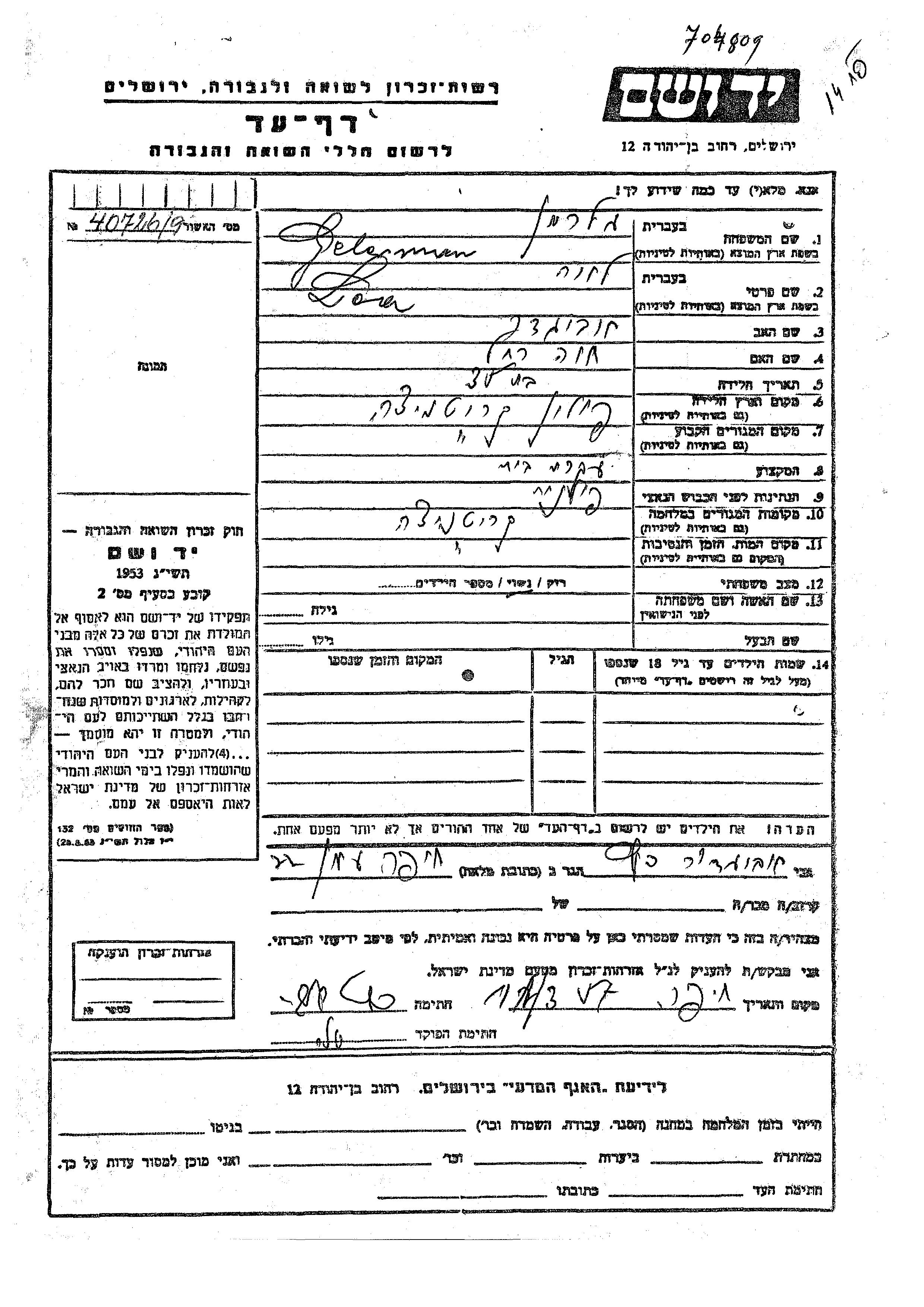 Lora Gelerman was born in Kritnica, Poland to Avigdor and Khaia Rakhel. She was a housewife and married. Prior to WWII she lived in Kritnica, Poland. During the war she was in Kritnica, Poland. Lora was murdered in the Shoah. Place of death: Kritnica, Poland.