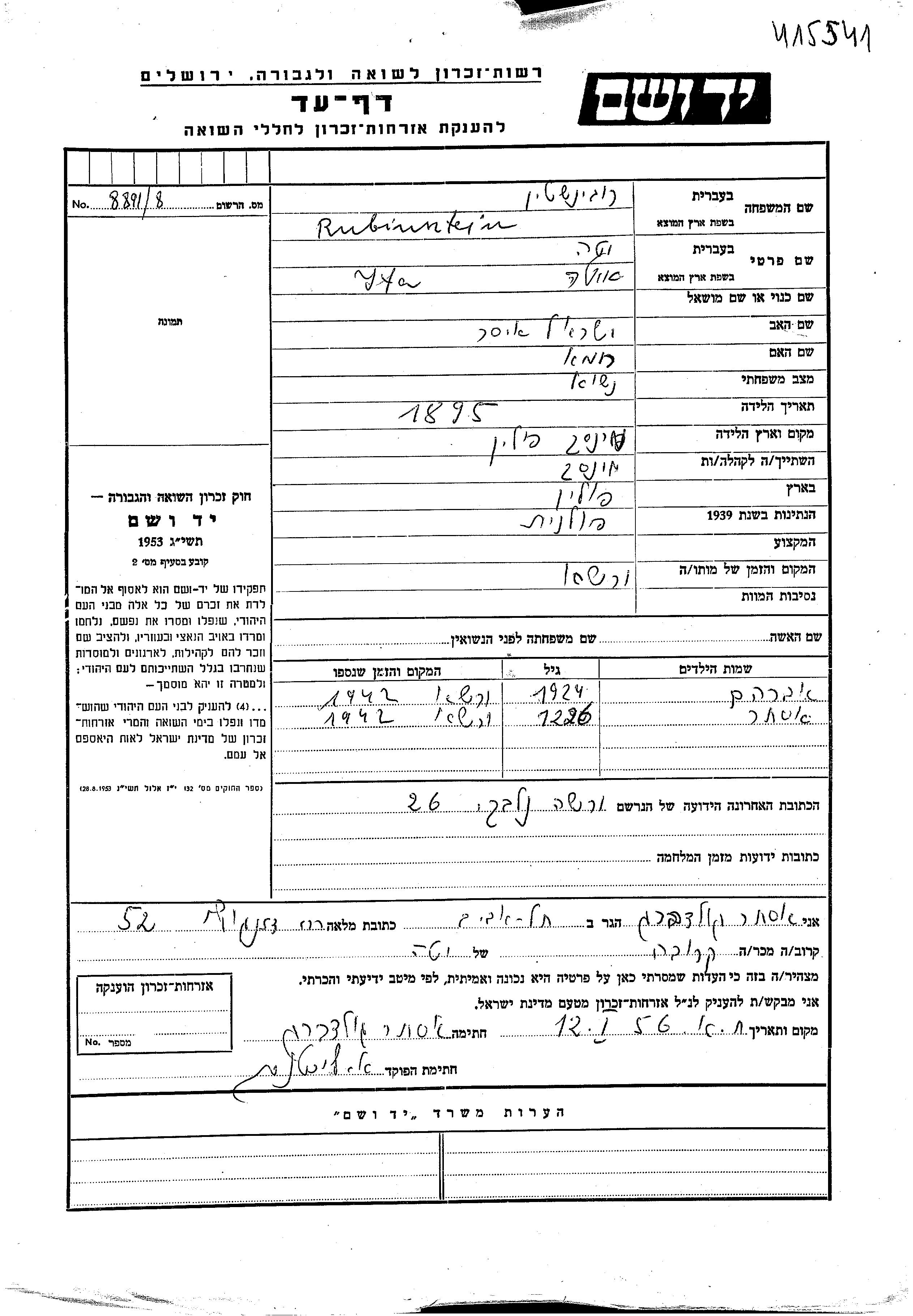 Ester Rubinstein was born, 1926 to Yeta. She was child. Prior to WWII she lived in Minsk, Belorussia (USSR). During the war she was in Warsaw, Poland. Ester was murdered in the Shoah.