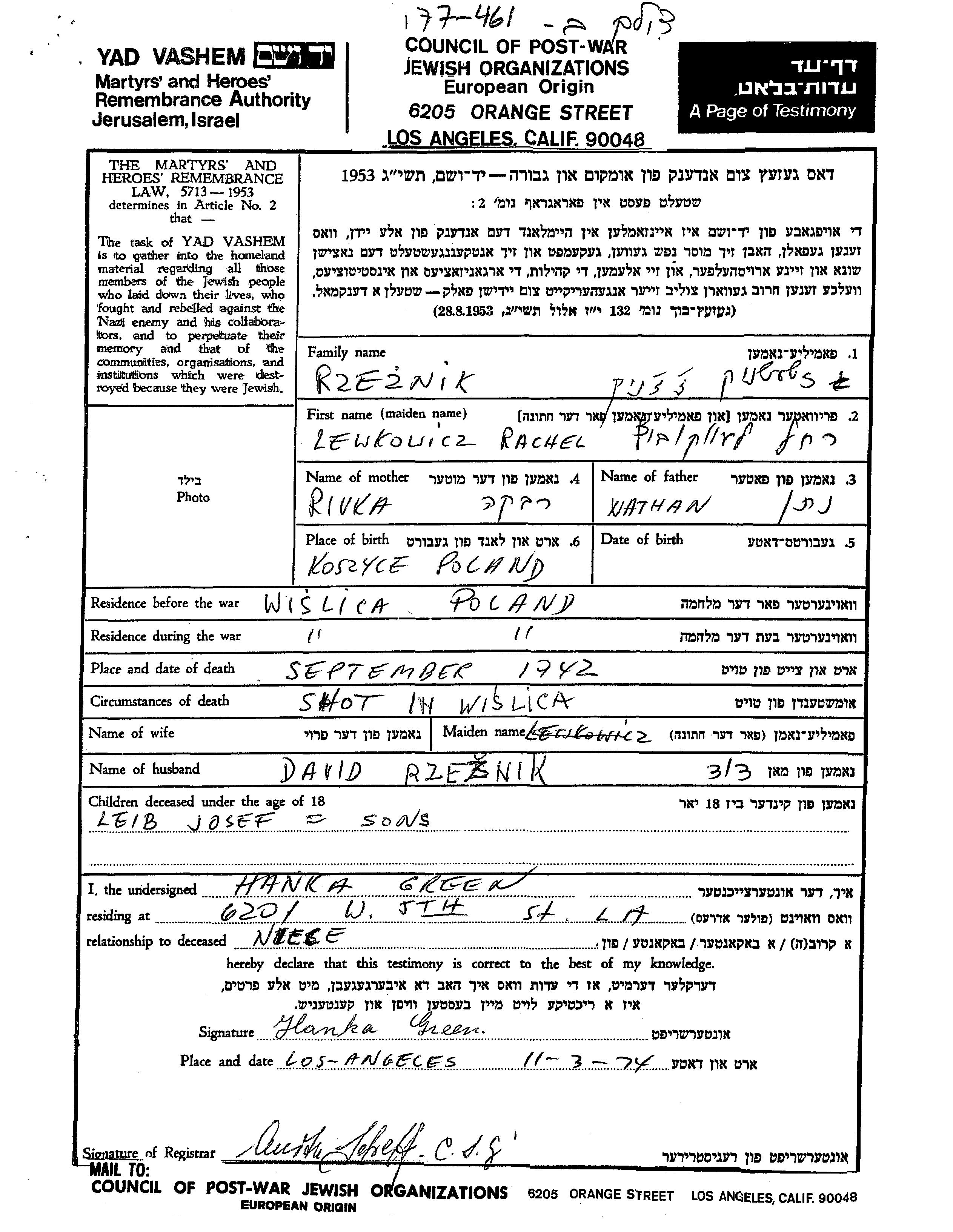 Rzeznik Josef Wislica, Poland Page of Testimony
