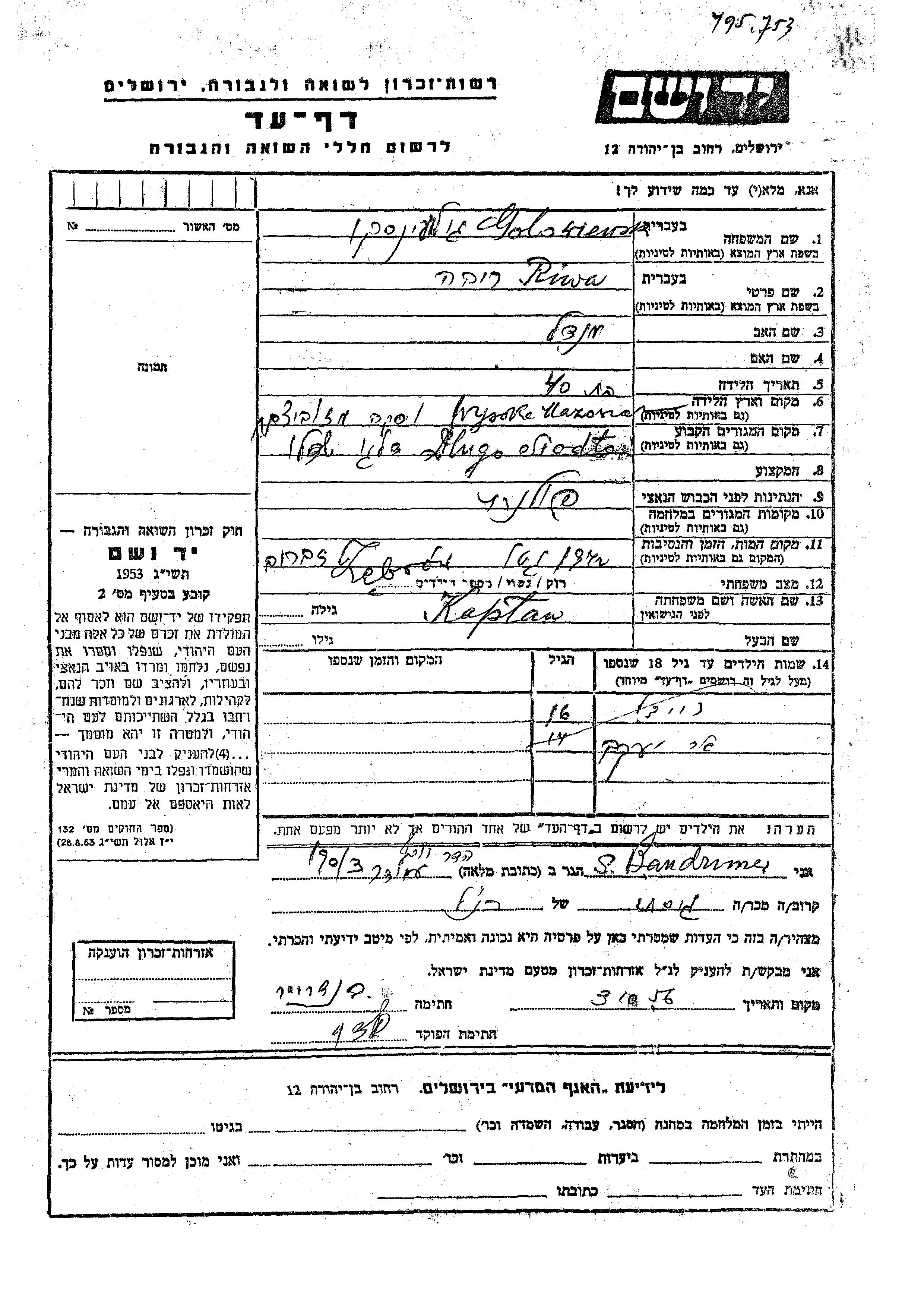Yaakov Golowienski was born to Riwa nee Kaplan. He was child. Prior to WWII he lived in Dlugo Siodlo, Poland.