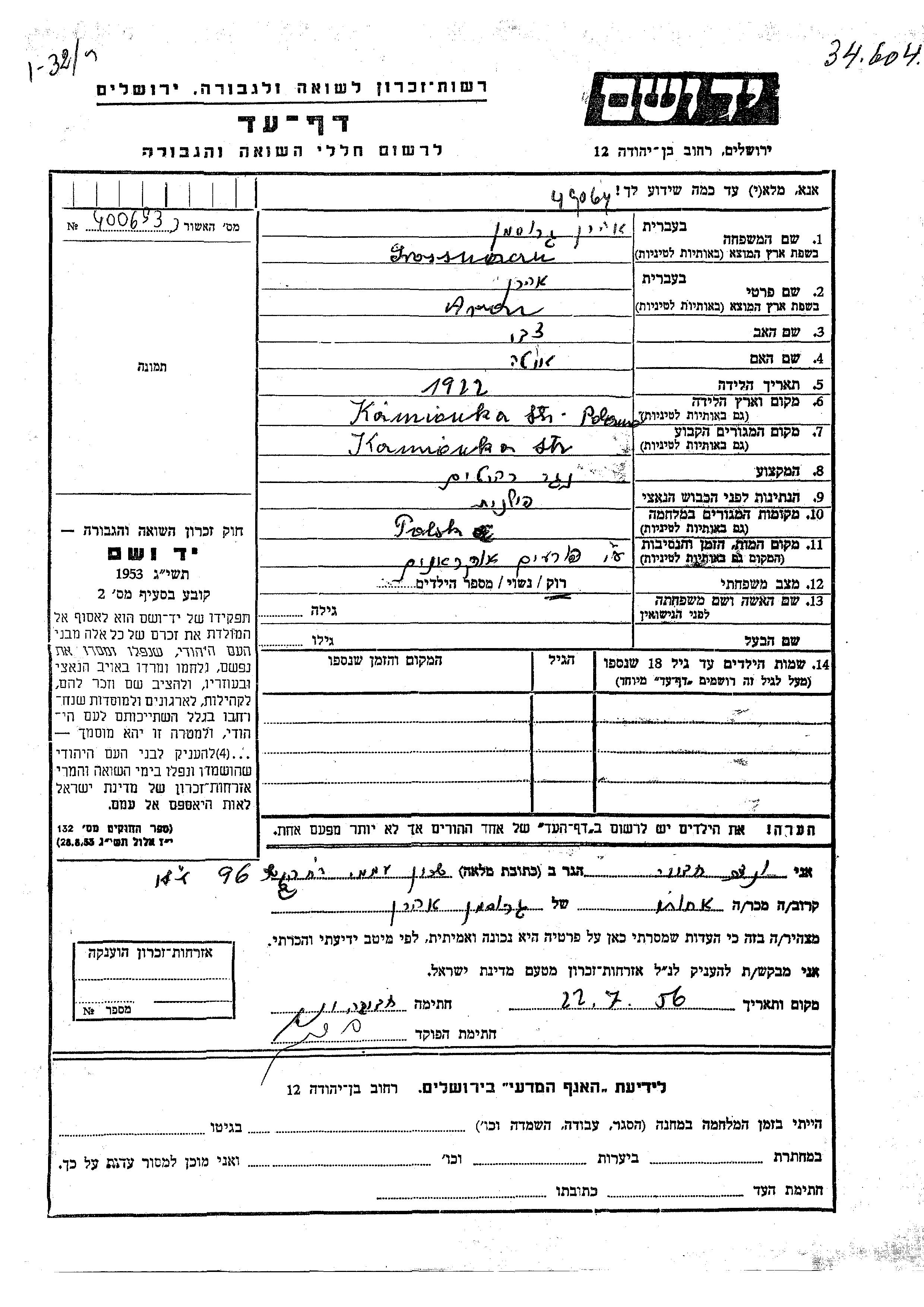 Aron Grossman was born in Kamionka, Poland, 1922 to Tzvi and Ita. He was a cabinet maker and single. Prior to WWII he lived in Kamionka, Poland. During the war he was in Poland. Aron was murdered in the Shoah.