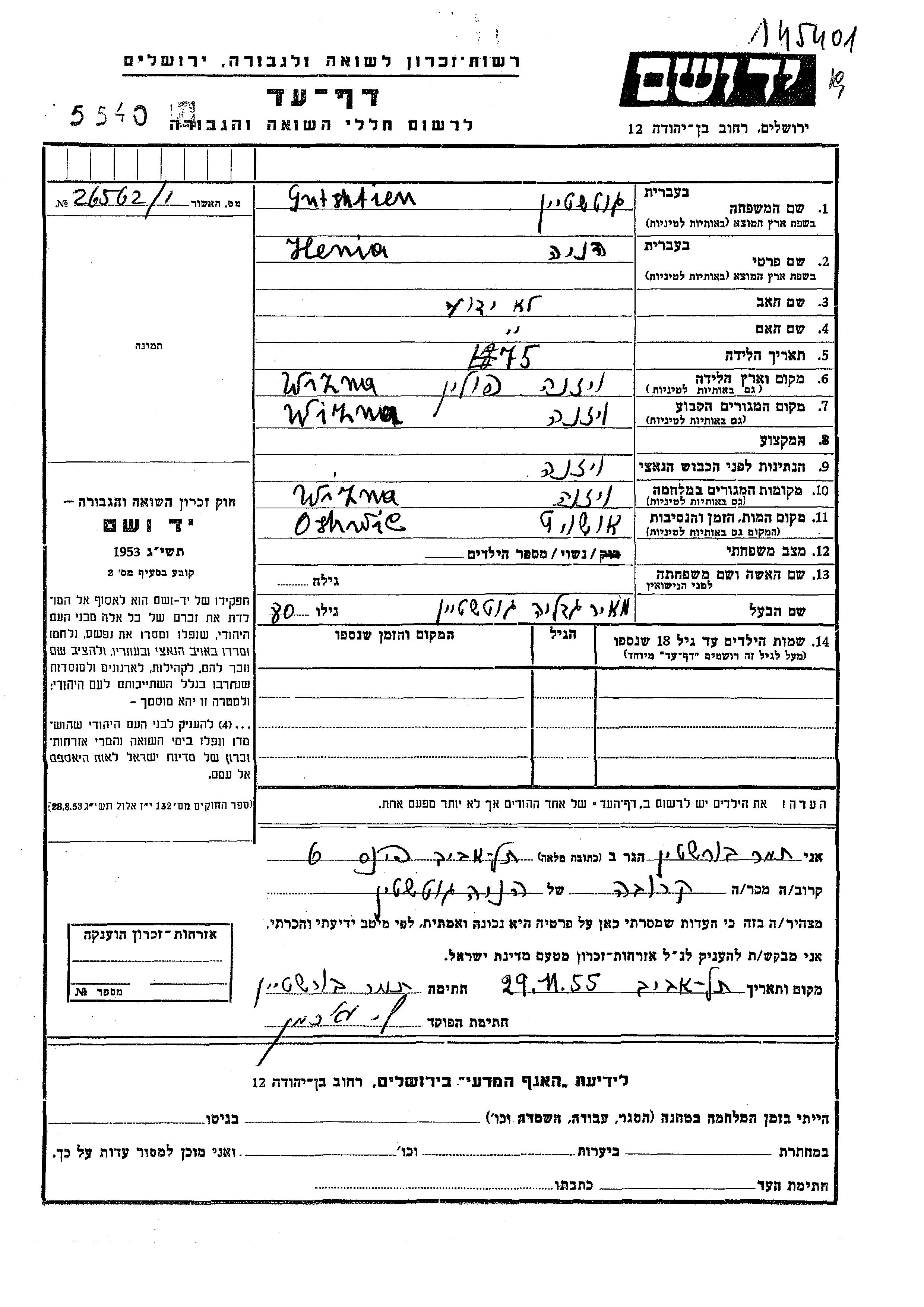 Henia Gutshtien Gotshtein was born in Wizna, Poland, 1875. She was married to Meir Gedalia. Prior to WWII she lived in Wizna, Poland. During the war she was in Wizna, Poland. Henia was murdered in the Shoah. Place of death: Auschwitz, Poland.