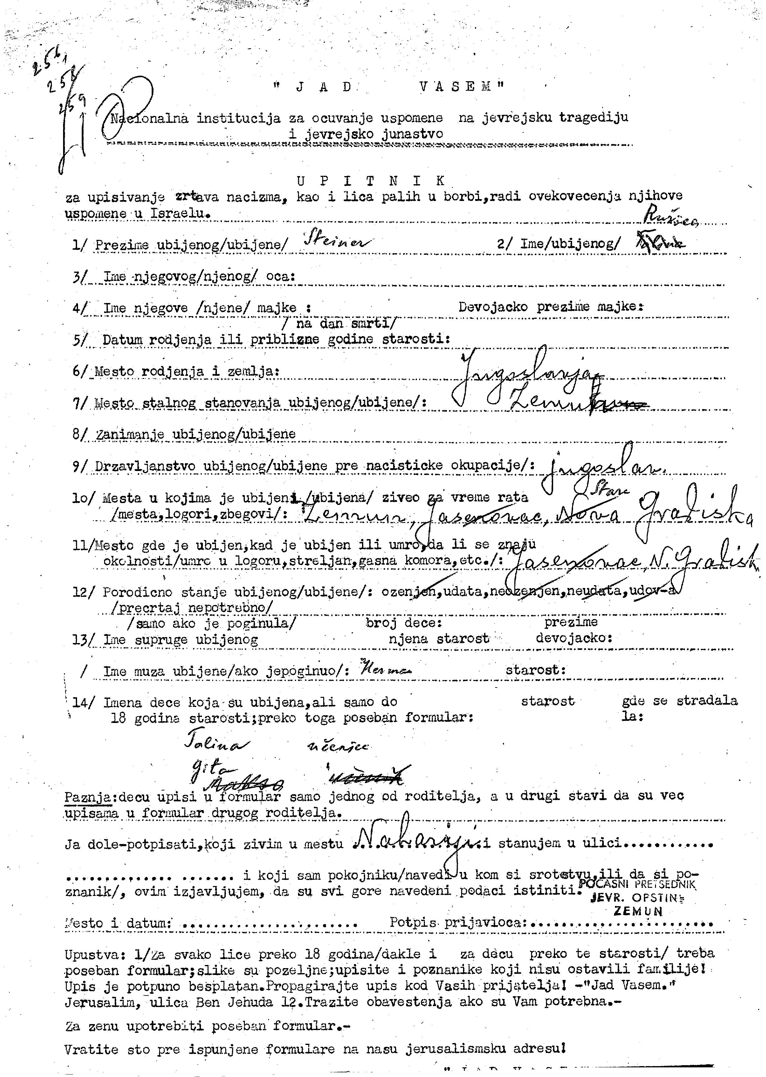 Steiner Polina Zemun, Yugoslavia Page of Testimony
