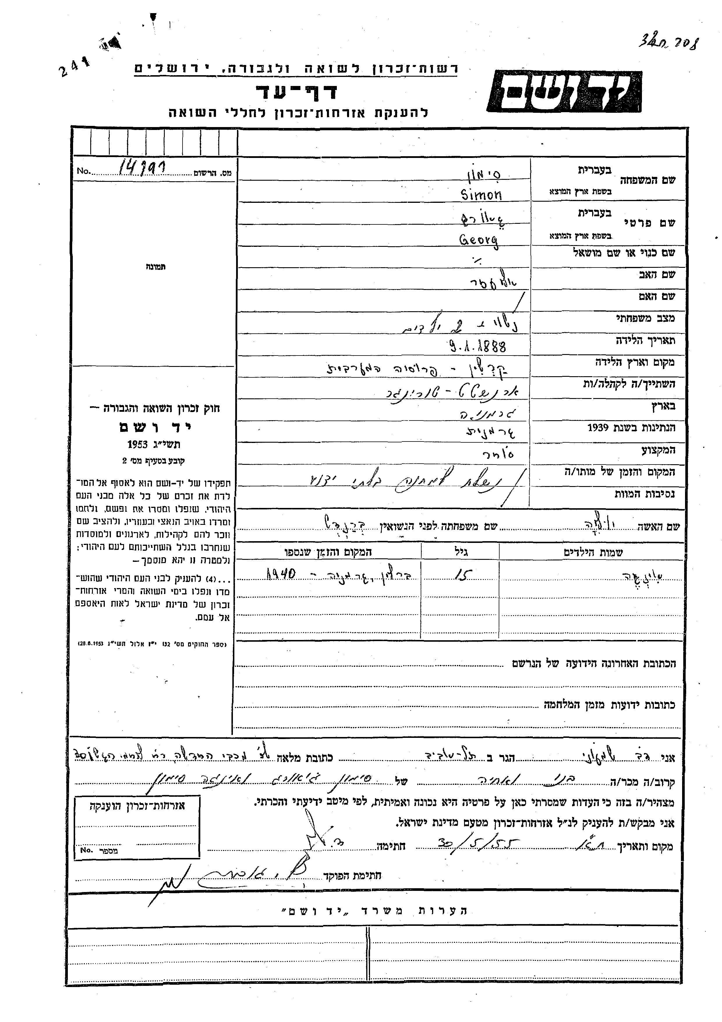 Yad Vashem - Pages of Testimony Names Memorial Collection