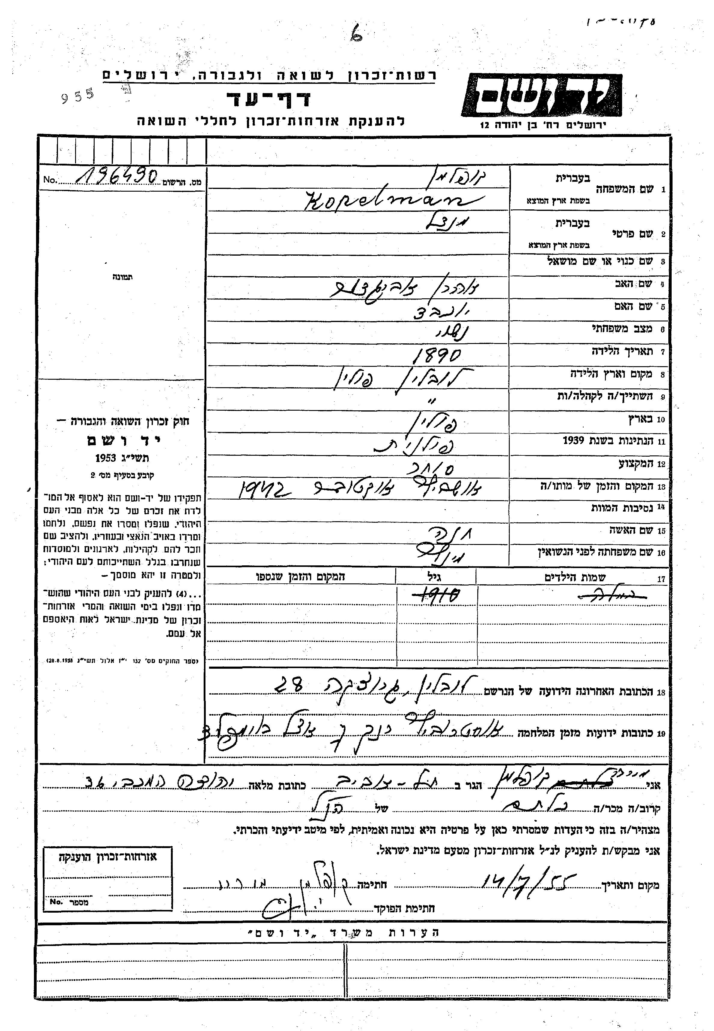 Yad Vashem - Pages of Testimony Names Memorial Collection