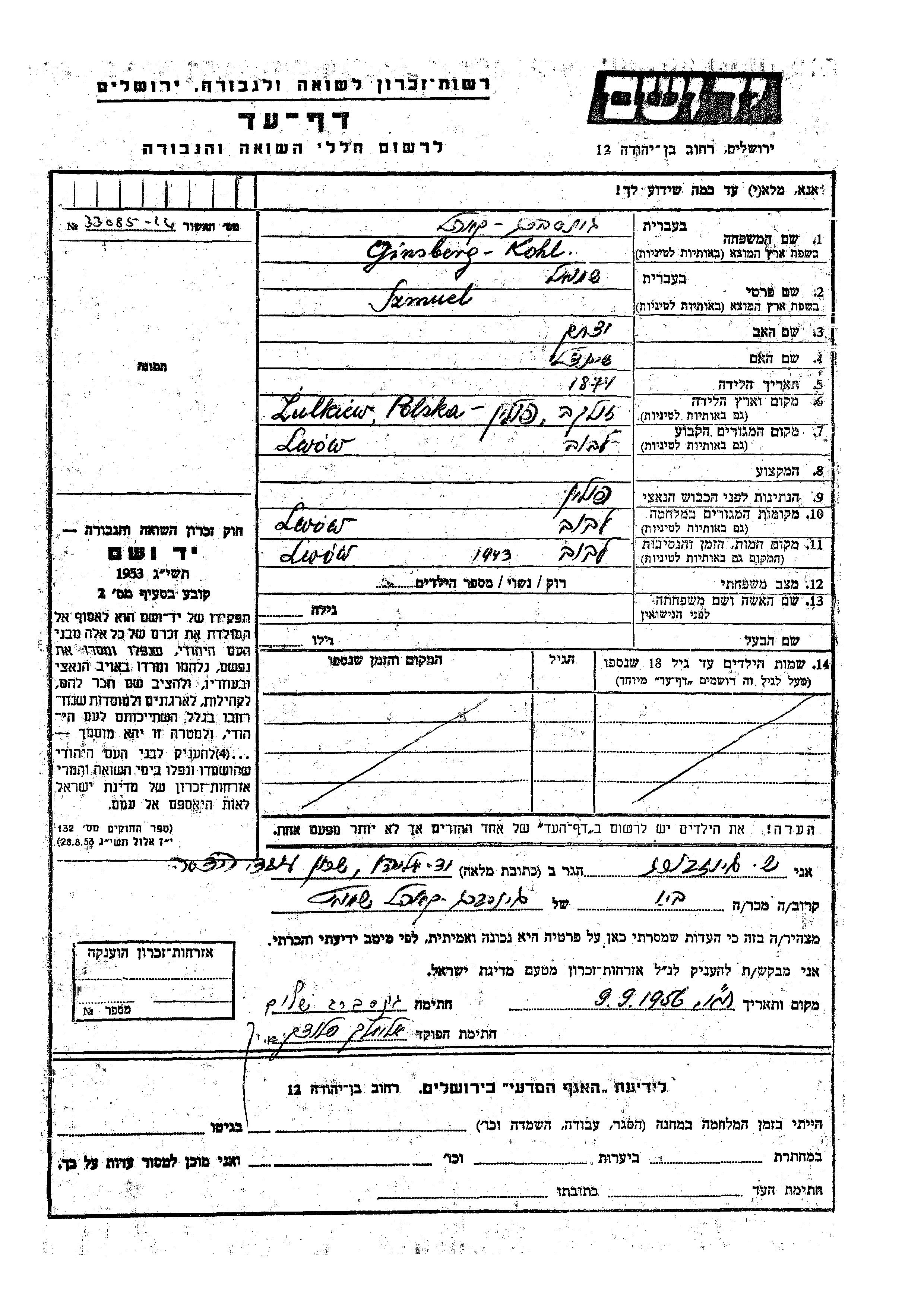 Szmuel Kul Ginsberg Koil Kohl was born in Zulkiew, Poland, 1874 to Yitzkhak and Sheindl. Prior to WWII he lived in Lwow, Poland. During the war he was in Lwow, Poland. Szmuel was murdered in the Shoah. Place of death: Lwow, Poland, 1943.