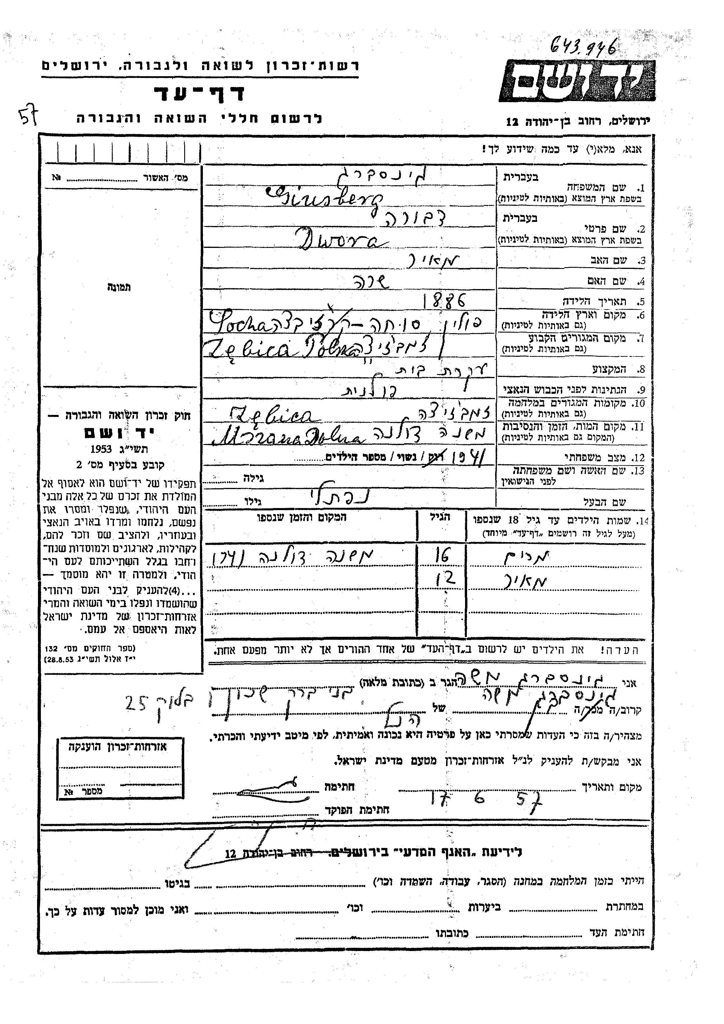 Dwora Ginsberg was born in Socha, Poland, 1886 to Meir and Sara. She was a housewife and married to Naftali. Prior to WWII she lived in Zebrzyce, Poland. During the war she was in Zebrzyce, Poland. Dwora was murdered in the Shoah. Place of death: Mszana Dolna, Poland, 1941.