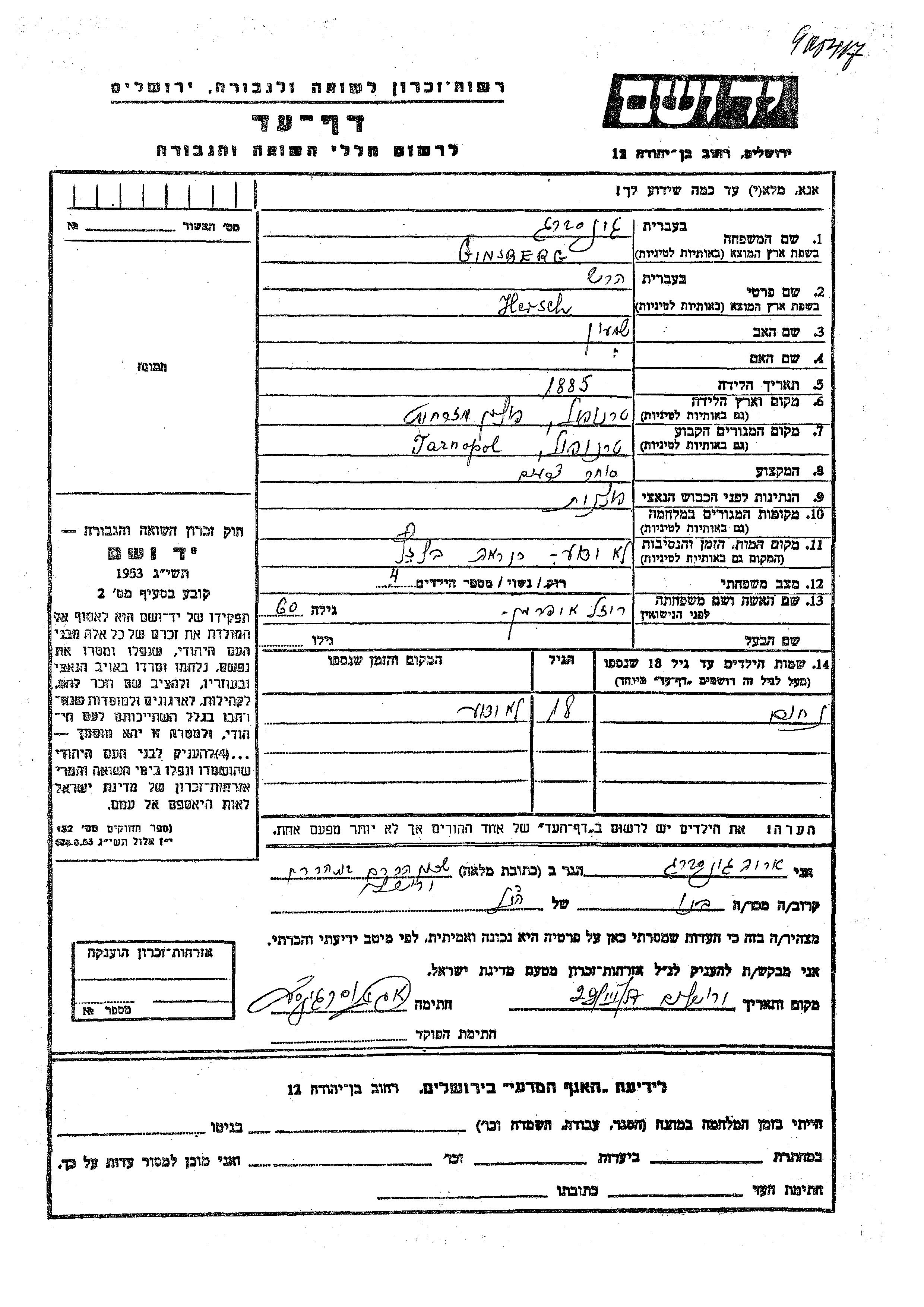 Hersch Ginsberg was born in Tarnopol, Poland, 1885 to Shimon. He was a paint dealer and married to Reizel nee Operman. Prior to WWII he lived in Tarnopol, Poland. Hersch was murdered in the Shoah. Place of death: Belzec, Poland.