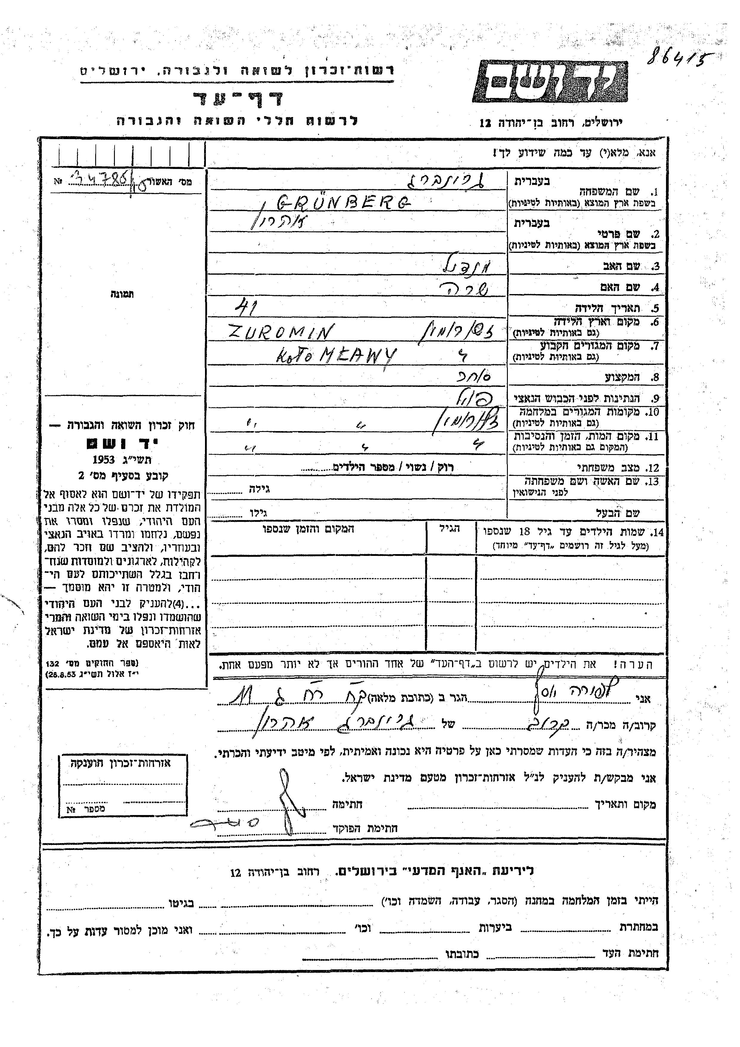 Aharon Grunberg was born in Zuromin, Poland to Mendil and Sara. He was a merchant. Prior to WWII he lived in Zuromin, Poland. During the war he was in Zuromin, Poland. Aharon was murdered in the Shoah. Place of death: Zuromin, Poland.