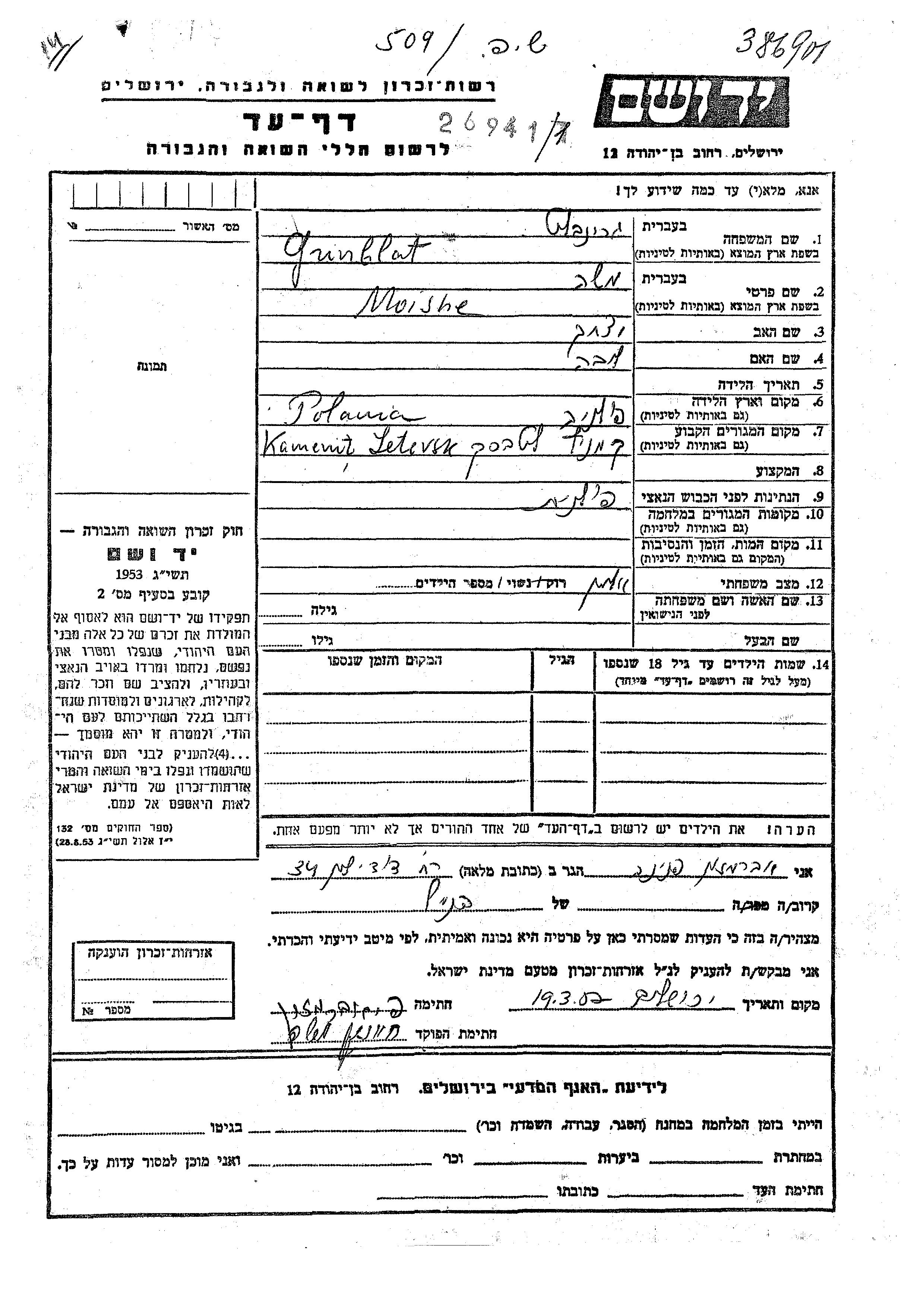 Grinblat Moishe Kamieniec Litewski, Poland Page of Testimony