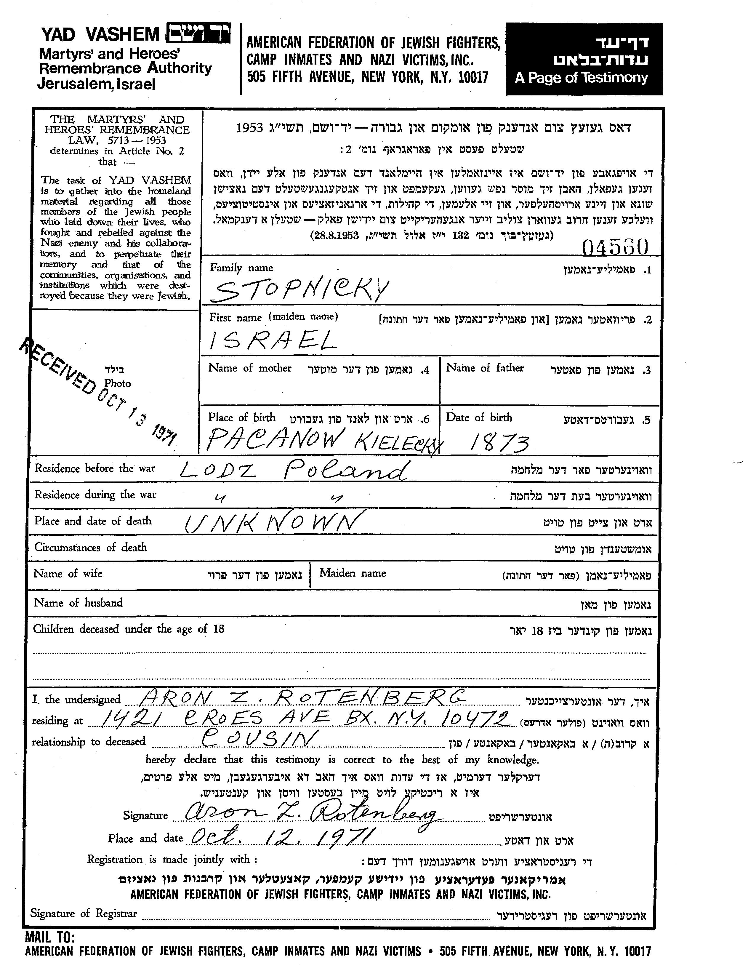 Stopnicky Israel 1873 Lodz, Poland Page of Testimony