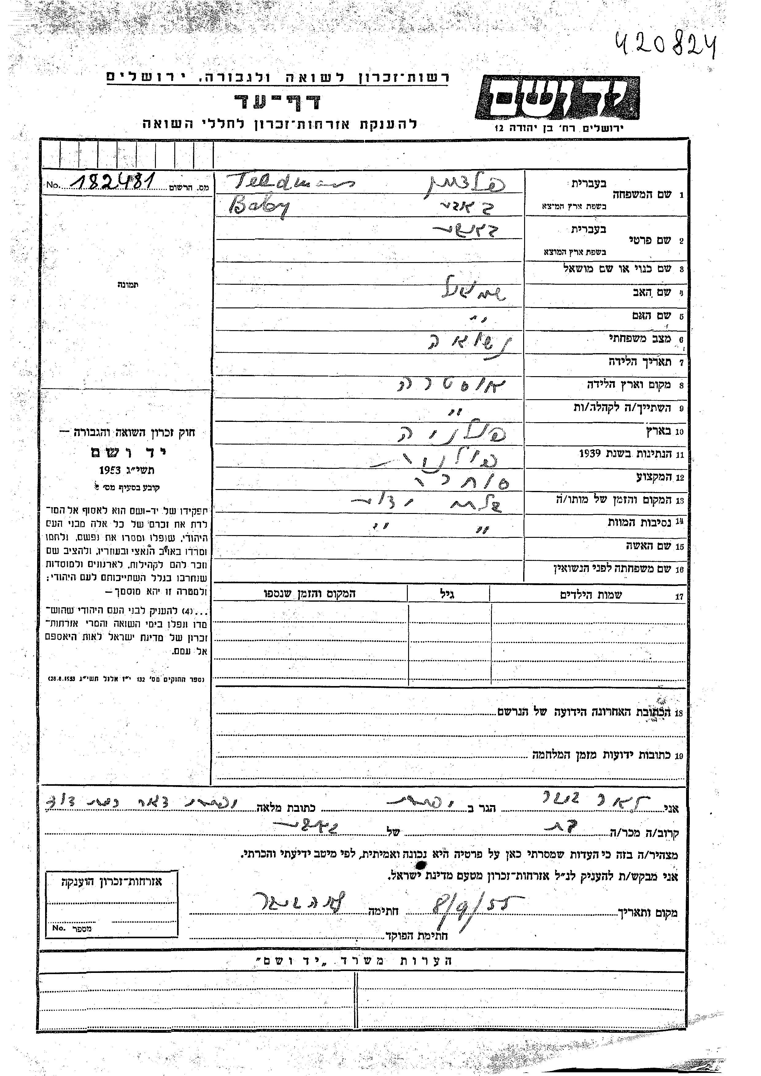 Yad Vashem - Pages of Testimony Names Memorial Collection