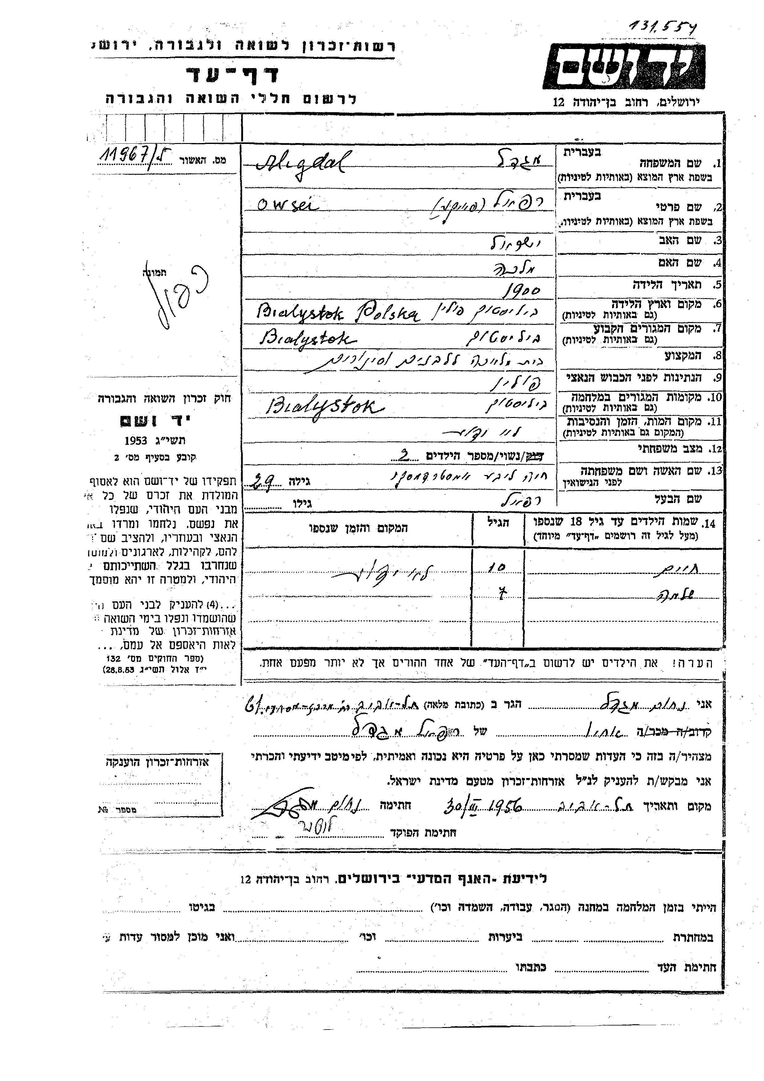 Khaim Migdal was born to Owsei Rafael Faike and Khaia Libe nee Amsterdamski. He was child. Prior to WWII he lived in Bialystok, Poland. During the war he was in Bialystok, Poland. Khaim was murdered in the Shoah.