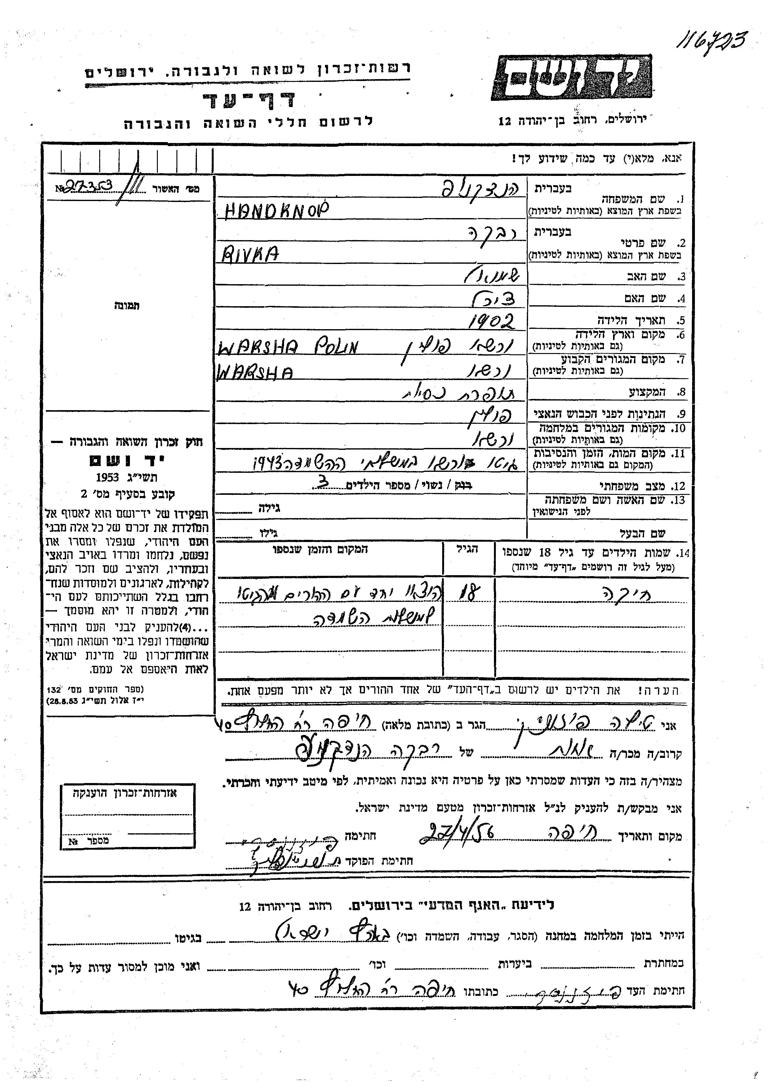 Khaika Handknop was born to Rivka. Was child. Prior to WWII lived in Warsaw, Poland. During the war was in Warsaw, Poland.