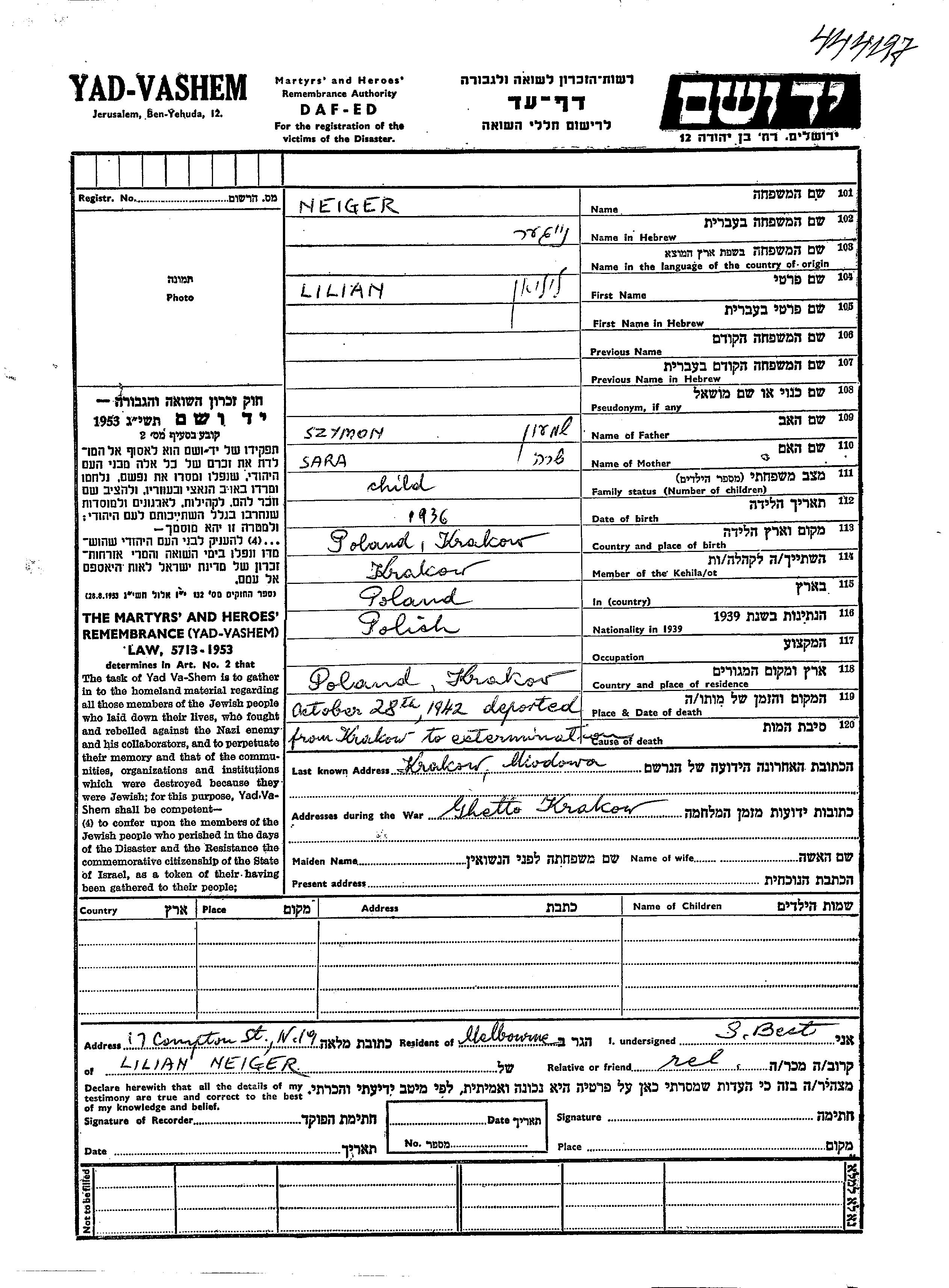 Neiger Lilian 1936 Krakow, Poland Page of Testimony