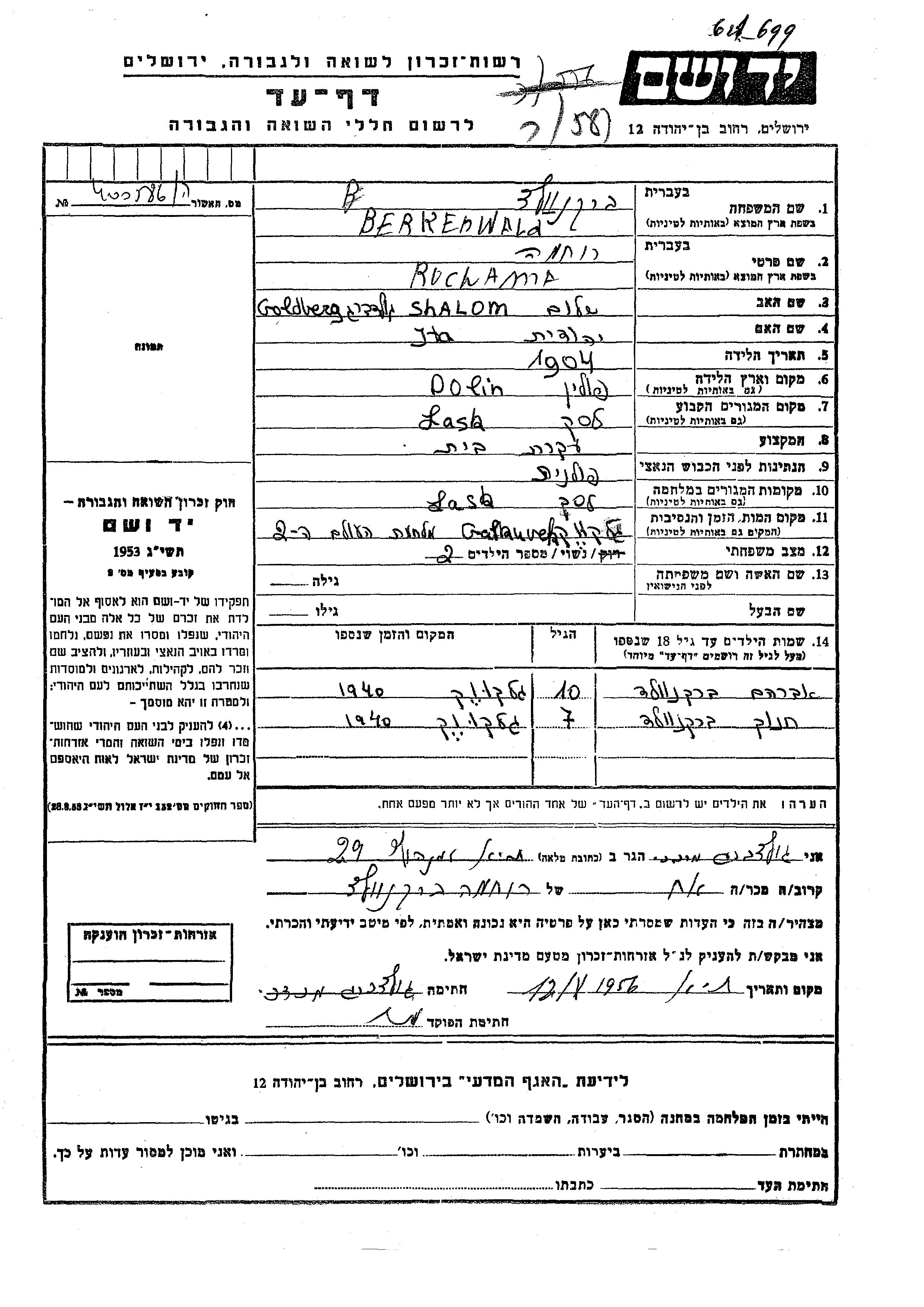 Berkenwald Avraham Lask, Poland Page of Testimony