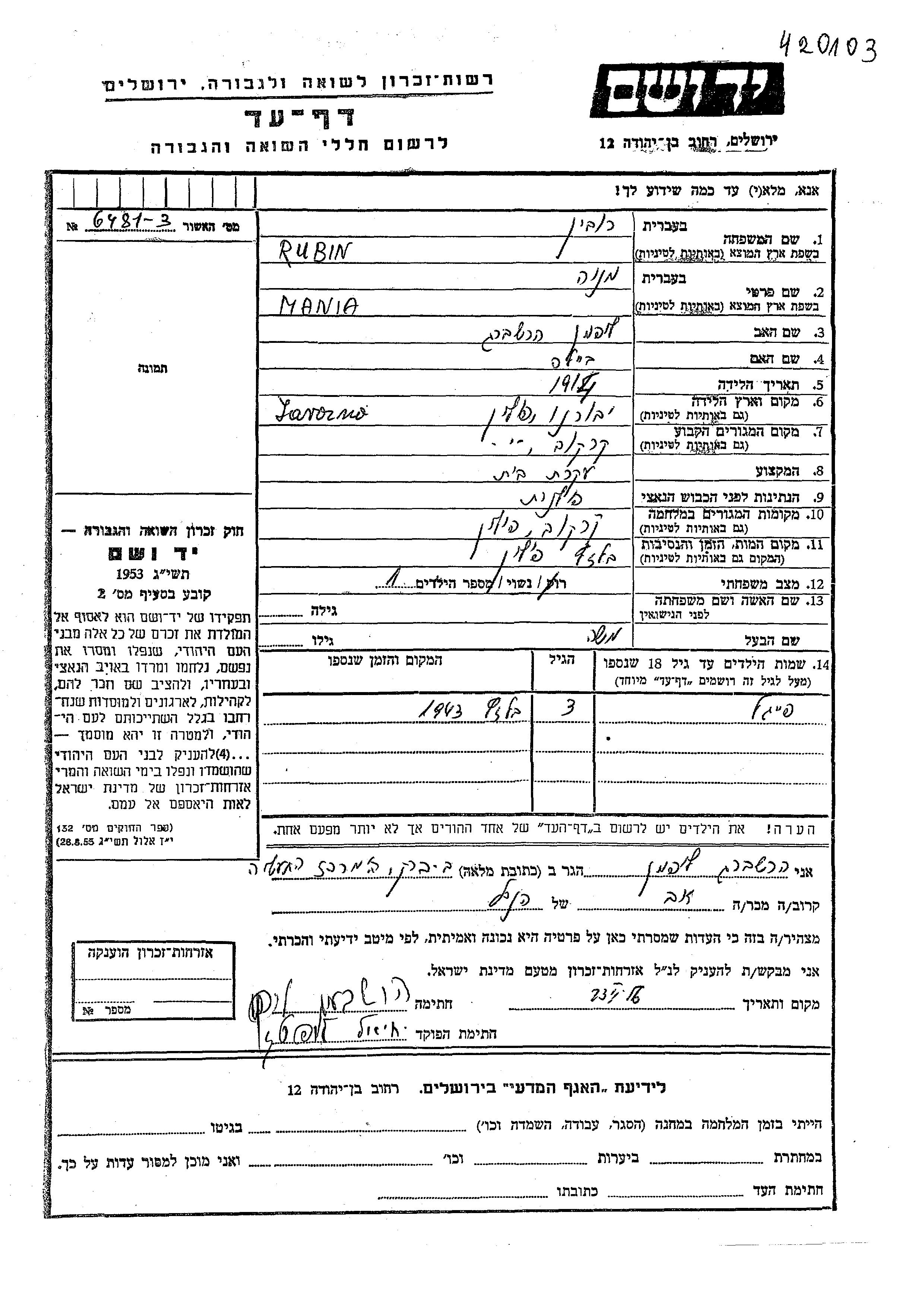 Yad Vashem - Pages of Testimony Names Memorial Collection