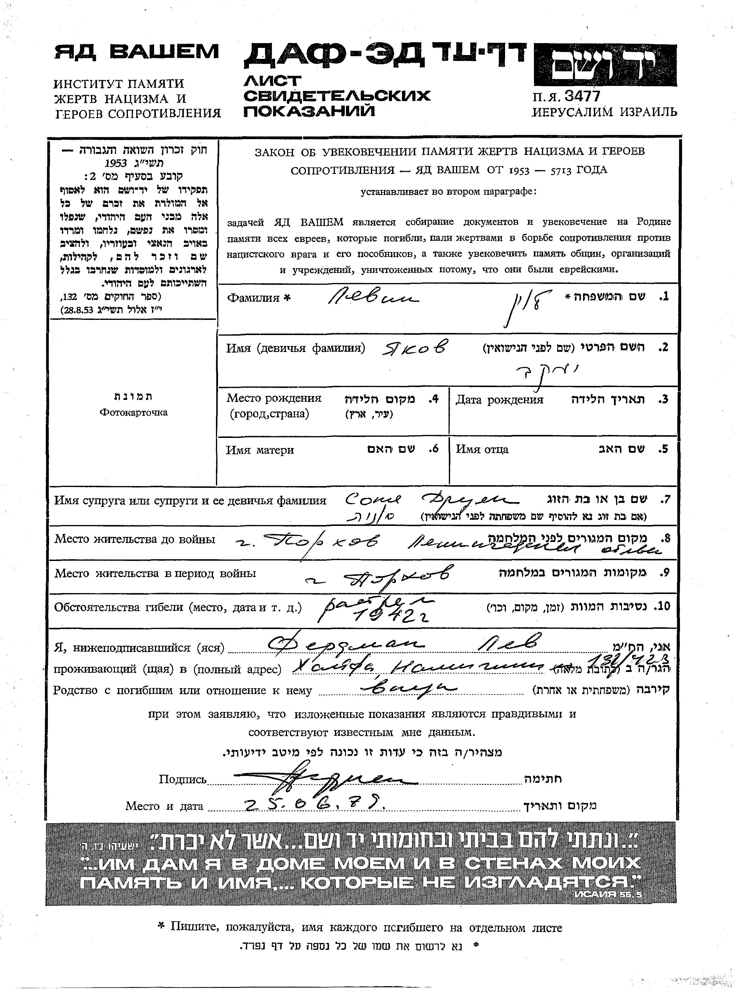 Yakov Levin. He was married to Sonya nee Druyan. Prior to WWII he lived in Porkhov, Russia (USSR). During the war he was in Porkhov, Russia (USSR). Yakov was murdered in the Shoah. Place of death: unknown, 1942.
