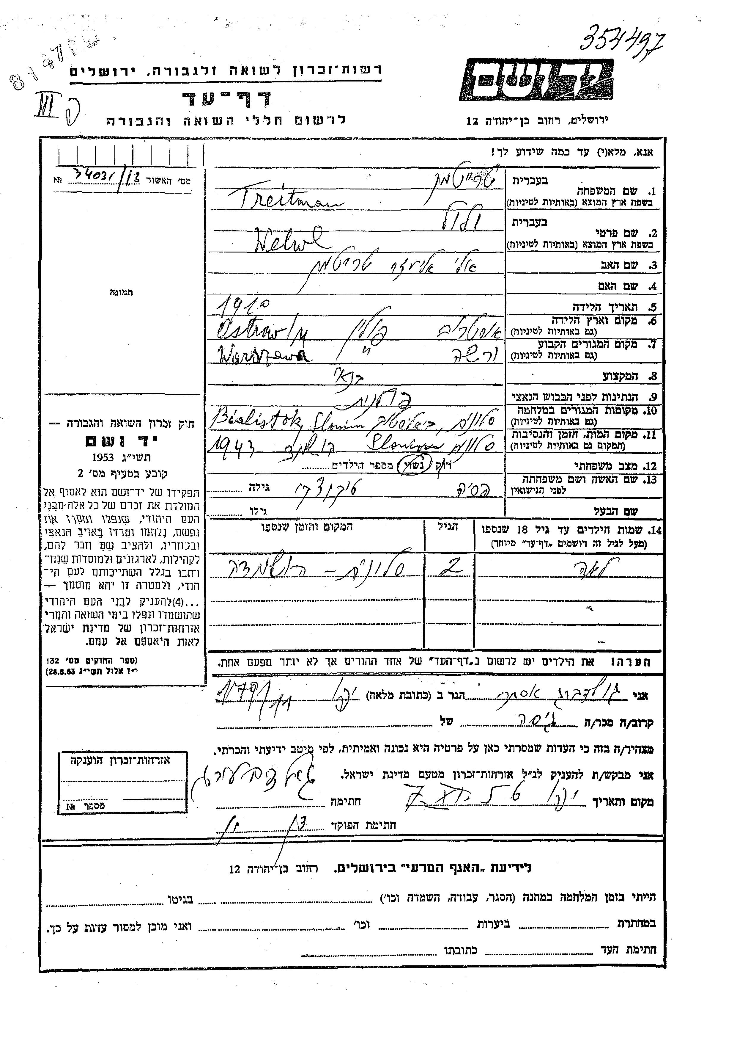 Lea Treitman was born to Welwl and Pesia nee Tikotzki. She was child. Prior to WWII she lived in Warszawa, Poland. During the war she was in Bialistok, Poland. Lea was murdered in the Shoah.