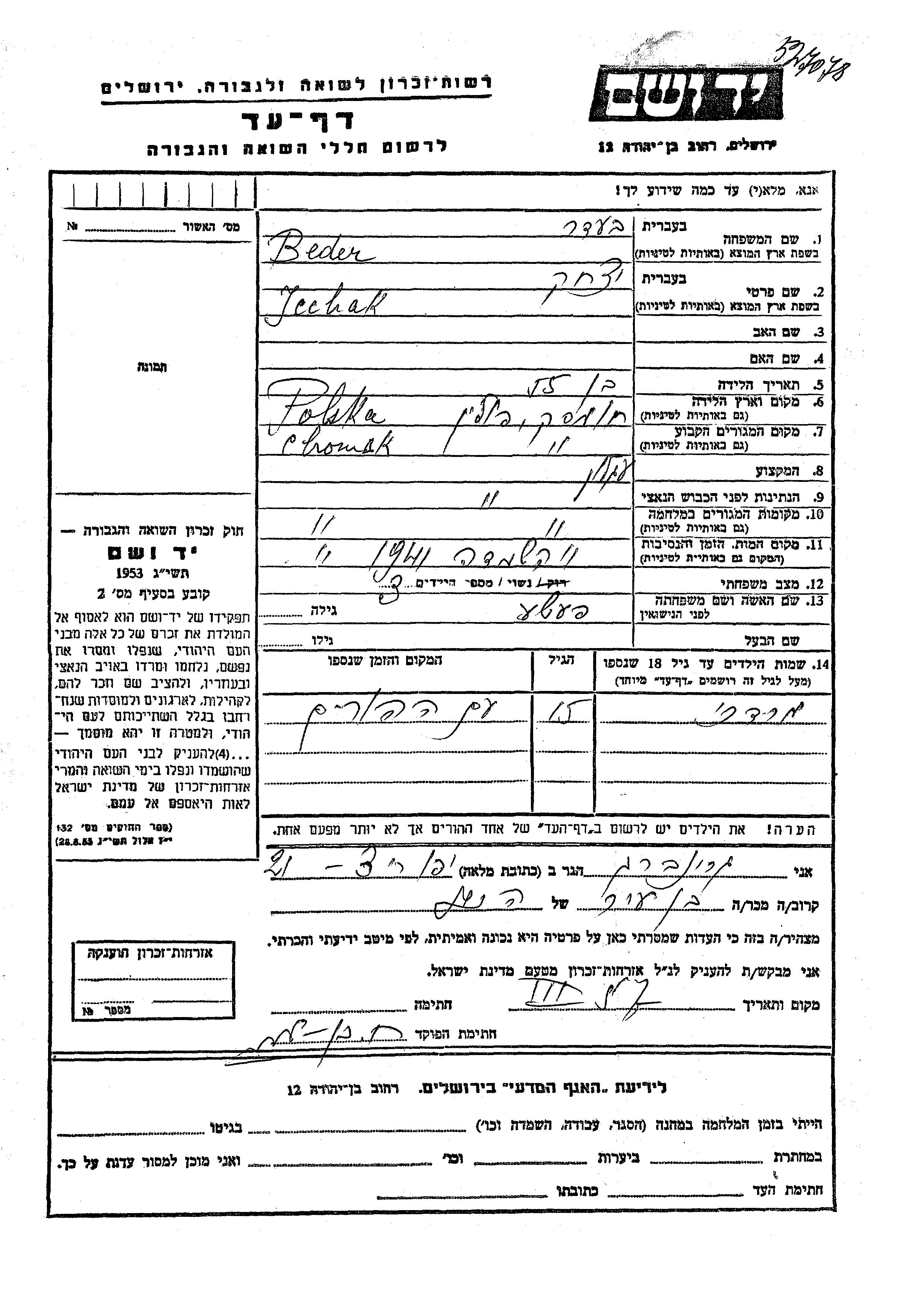 Mordekhai Beder Bader was born to Icchak and Peshe. He was child. Prior to WWII he lived in Chomsk, Poland. During the war he was in Chomsk, Poland. Mordekhai was murdered in the Shoah.