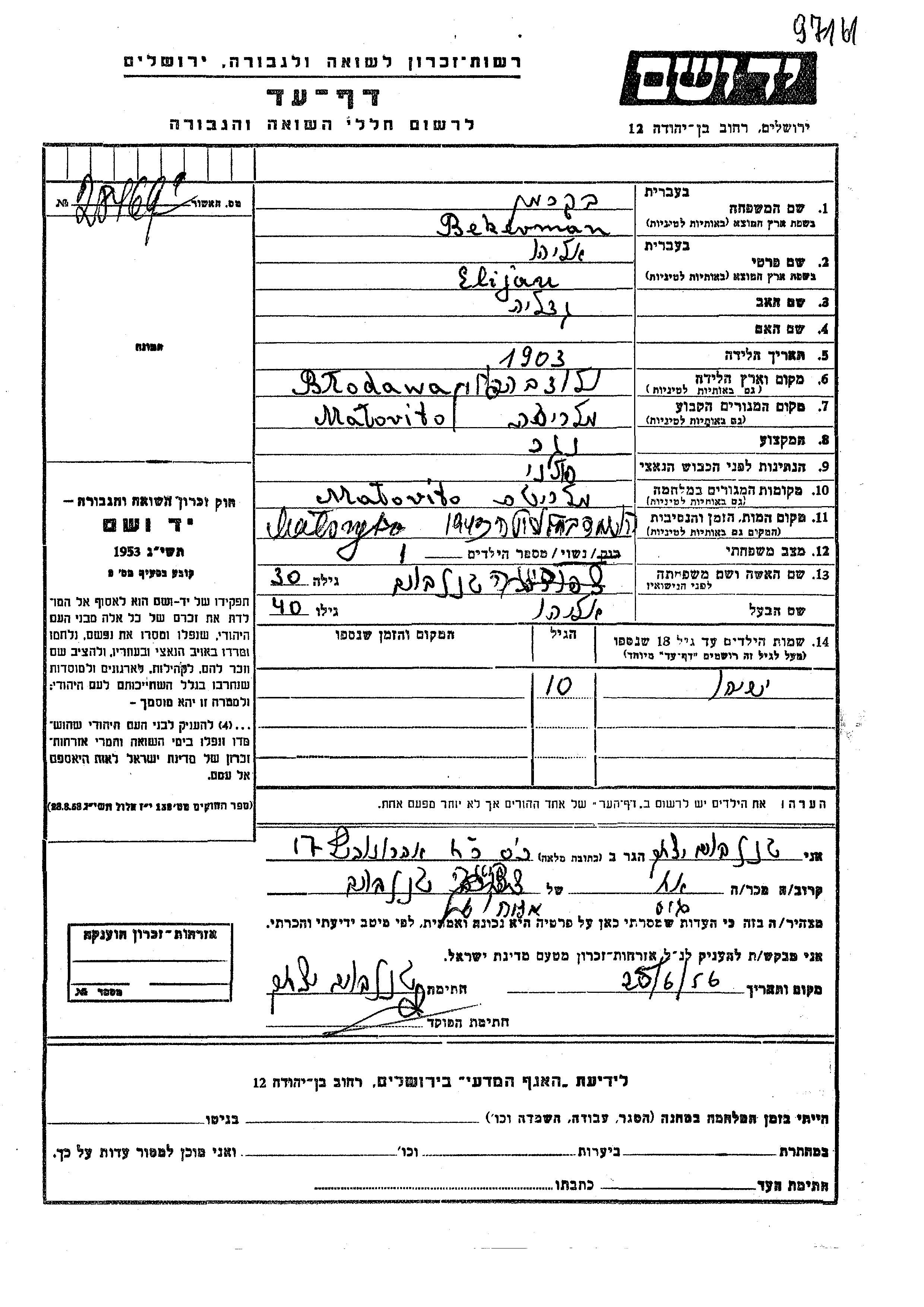 Ieshaiahu Bekerman was born to Elijahu and Feiga. He was child. Prior to WWII he lived in Malorita, Poland. During the war he was in Malorita, Poland. Ieshaiahu was murdered in the Shoah.